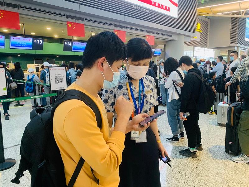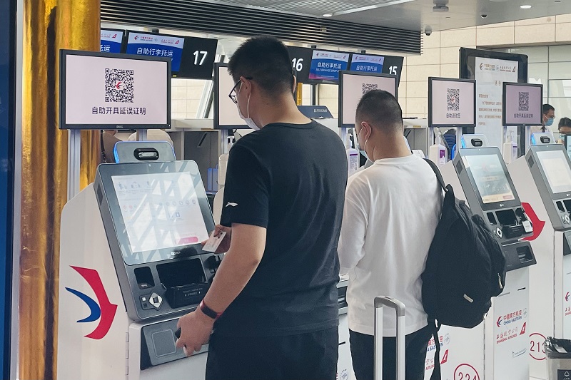 在东航值机服务柜台,人工服务和自助服务齐发力,做好旅客航班服务及保障工作,自助设备上方提供二维码,扫码即可自助改签和开具延误证明;在“东航爱心服务专区”,增加工作人员为需要关注的特殊旅客提供爱心服务,为旅客解疑答惑,协助旅客便捷出行;在登机口,工作人员细心提示旅客上下机注意脚下安全,确保旅客安全出行。