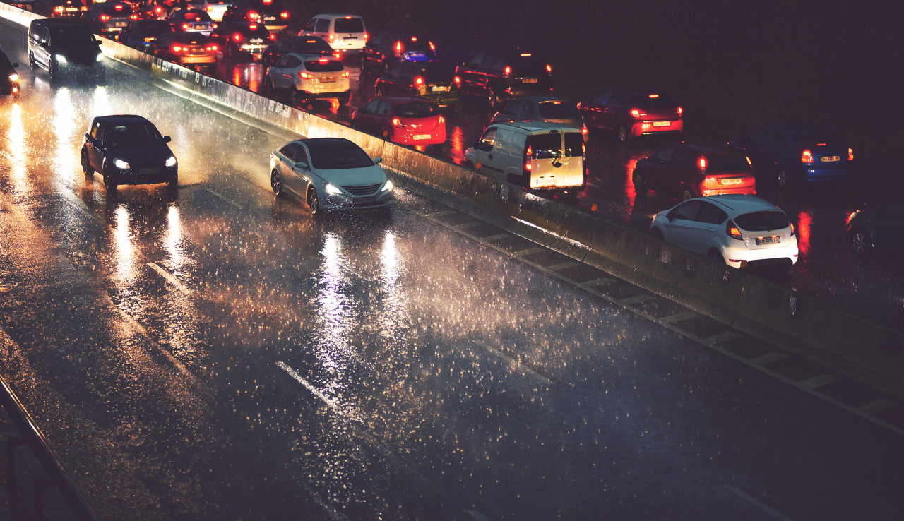 雨中行车时,路面上的雨水与轮胎之间形成“润滑剂”,使汽车的制动性变差,容易产生侧滑。因此,驾驶人要双手平衡握住方向盘,保持直线和低速行驶,需要转弯时,应当缓踩刹车,以防轮胎抱死而造成车辆侧滑。