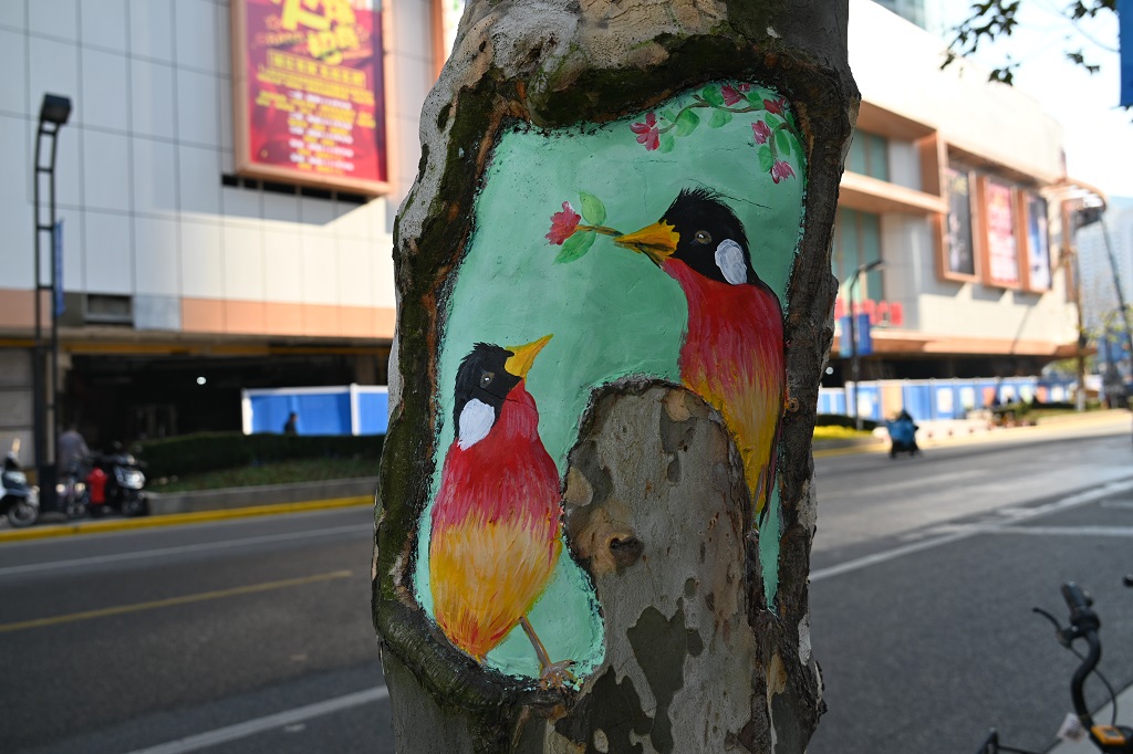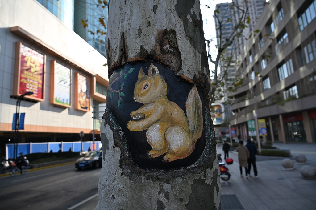 据了解,每年冬天,当树木进入冬眠时,行道树养护人员都要对树木进行养护,通过修补树洞来提升树姿,减少病虫害侵蚀。虹口区绿化市容部门工作人员介绍说,树洞修复是树木养护中的一项重要工作,传统是用水泥、石灰等材料把树洞堵上,修补后常留有疤痕,给人一种寒冷灰暗的感觉,既不美观又与街容街景不协调。为此,绿容部门决定尝试在四川北路部分行道树和北外滩滨江绿地树洞上进行作画,以便让树木更加美观。
