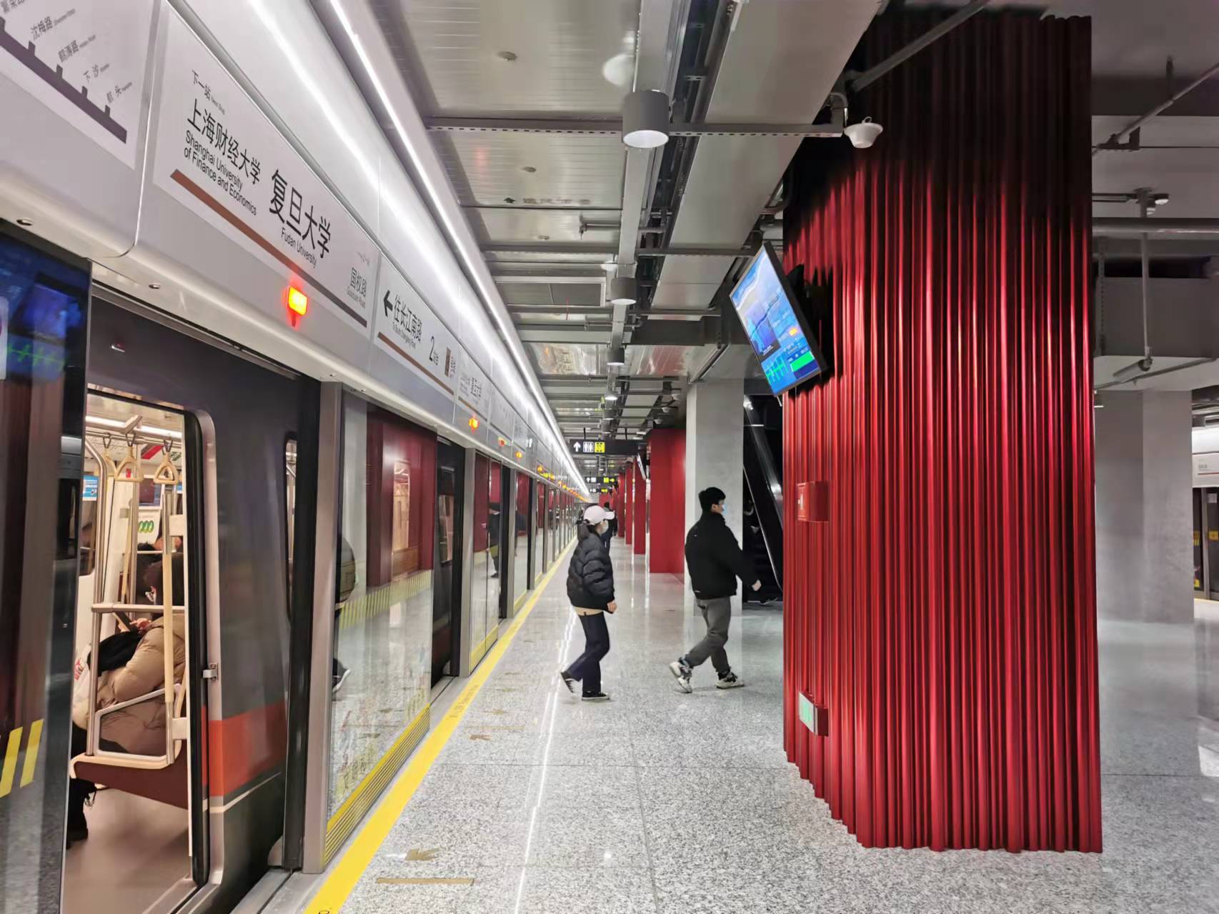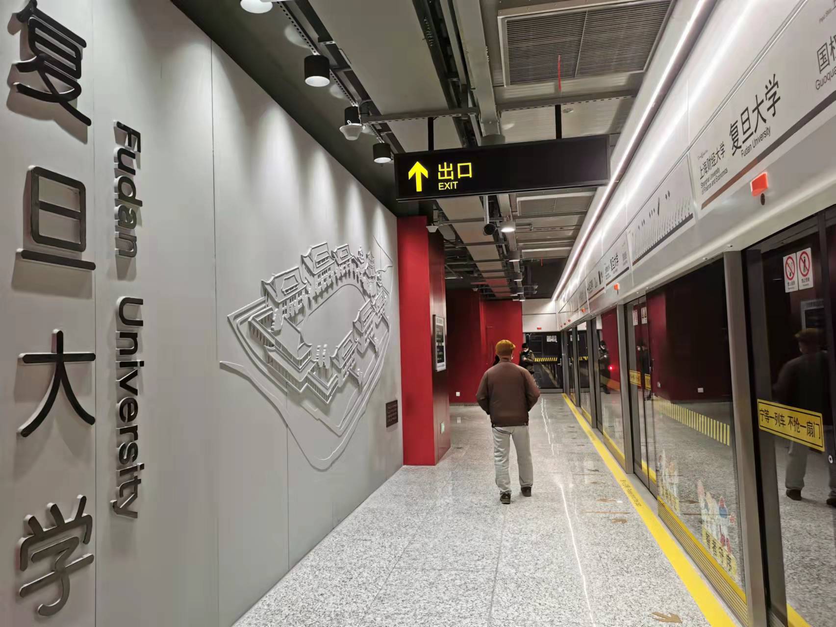 站名墙是以复旦大学1920年奠基江湾时的校园规划图为蓝本,呈现复旦人精神家园的风貌。站厅内氤氲浓郁的书卷气息,整体特色与地域文化相结合,赋予复旦大学站更多的文化与历史内涵。公共艺术墙采用水泥肌理,辅以层层叠叠的灯光展现写意山水。这正是基于山水长卷《千里江山图》《富春山居图》的创意灵感,柔和的白色灯光则让其变得灵动起来。