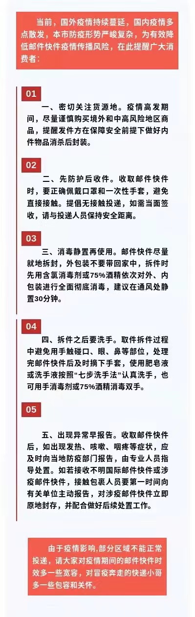 上海邮政管理局提醒:对于消费者来说,近期如果不是很急,可暂缓寄出快递,如果一定要接收快递,那就做好个人防护。