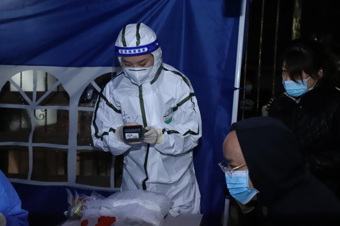 3月20日,原定是待嫁新娘赵莹披上洁白婚纱手捧鲜花的大喜日子,但她却被一身白色防护服裹得严严实实,手里的鲜花也变成了一支健康云二维码扫码仪。因为此刻,她是一名奋战在社区核酸筛查一线的志愿者。