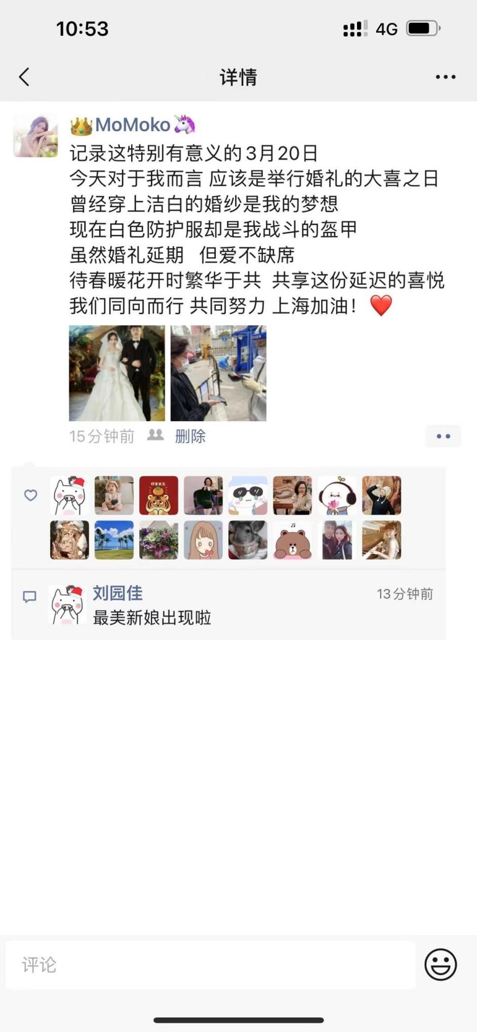 在原本计划结婚的日子,赵莹在朋友圈发送了一条消息:“曾经,穿上洁白的婚纱是我的梦想,现在,白色的防护服是我的战斗盔甲,虽然婚礼延期了,但爱不缺席……”。