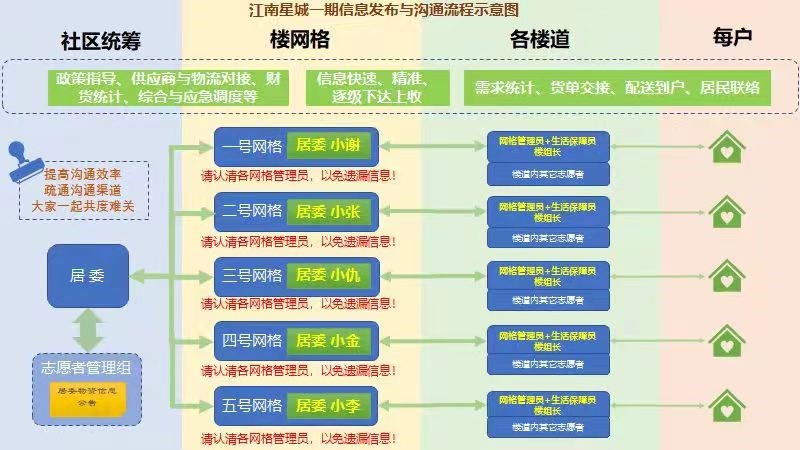 为何能如此高效快捷地解决居民燃眉之急?这背后源自小区编织了一张“信息网”,理顺了信息发布路径和接收机制,以网格化的形式打通了小区信息壁垒。居委会负责社区整体统筹,开展政策指导、供应商与物流对接、财货统计、应急调度等工作。下设由居委工作人员主管的5个网格,通过网格群通知疫情最新信息。每个网格覆盖多个楼道,楼道以“3+n”的方式为居民解决生活保障最后100米的问题。“3”即网格管理员、生活保障员和楼组长,“n”即楼道内其他志愿者,形成合力来完成需求统计、货单交接、配送到户和居民联络等工作。