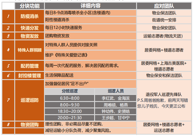 日报中还提到了小区防疫消杀具体安排,每日8:00至9:00,物业进行全小区包括楼道内外的的消毒喷杀,确诊楼栋则由街道统一安排消杀工作。小区巡逻先锋队是由退役军人组成的,每日分4班,每班2人进行巡逻,督促居民“足不出户”。随着巡逻日志在日报中公开,“足不出户”的理念也更加深入人心。退役军人们更是铁汉柔情,在巡逻之余,他们还主动关怀老人,陪独孤的老人说说话,乐观地安慰开导他们。