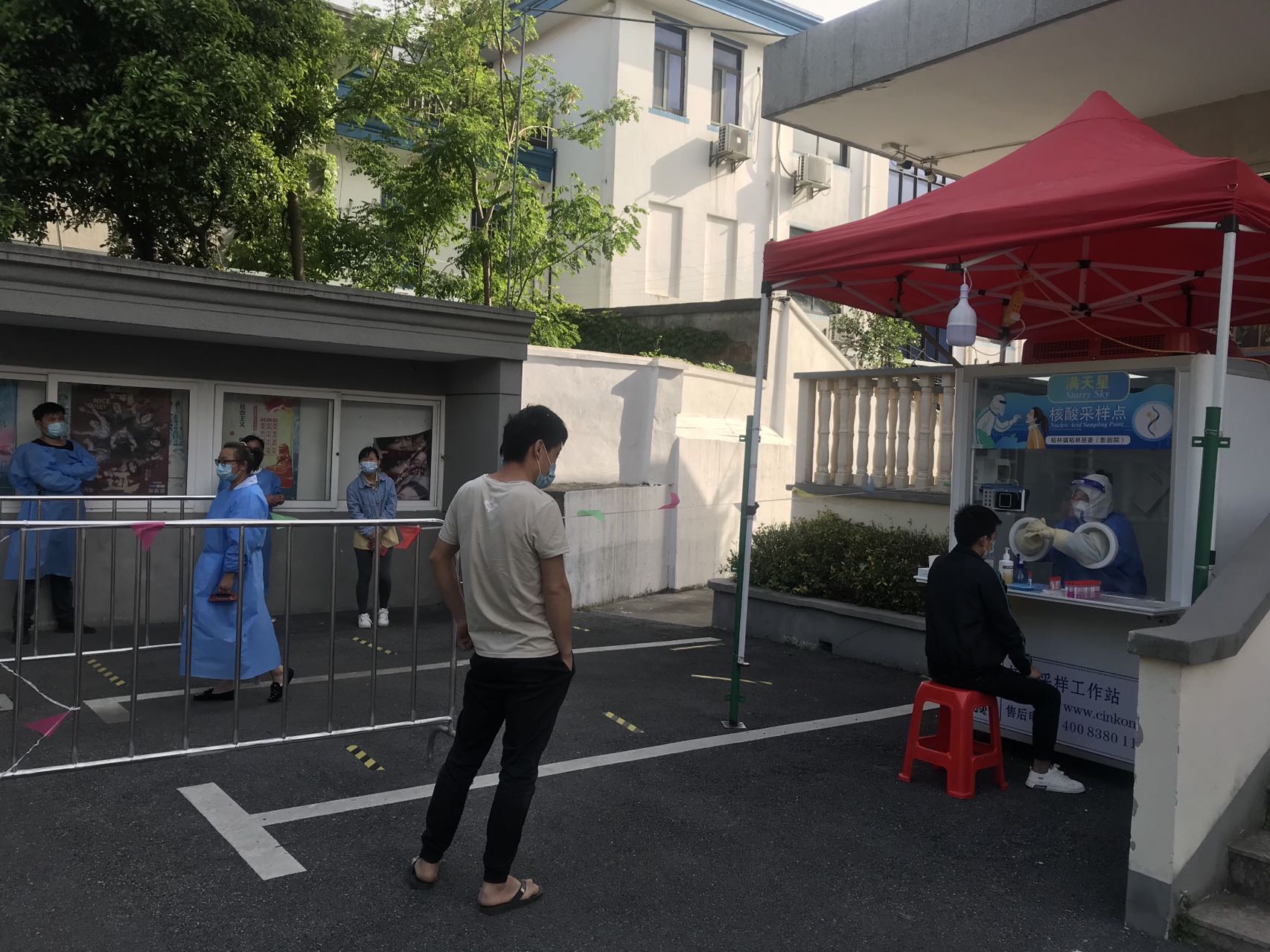 下午3点25分,柘林影剧院“满天星”核酸采样点即将开放,在现场志愿者的引导下,不少市民已经在影剧院前的广场上,有序排起了队伍。