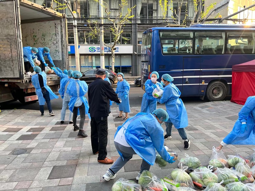 分发物资时女生志愿者也不输男生,照样搬搬扛扛,非常能吃苦,每次都是将物资一一准确地送到老人们的家门口。小区封控的日子里,老人有任何生活上的困难,志愿者们都会询问并且提供帮助。曾经互不相识的邻居,短短几天已经成为了心心相惜的一家人。