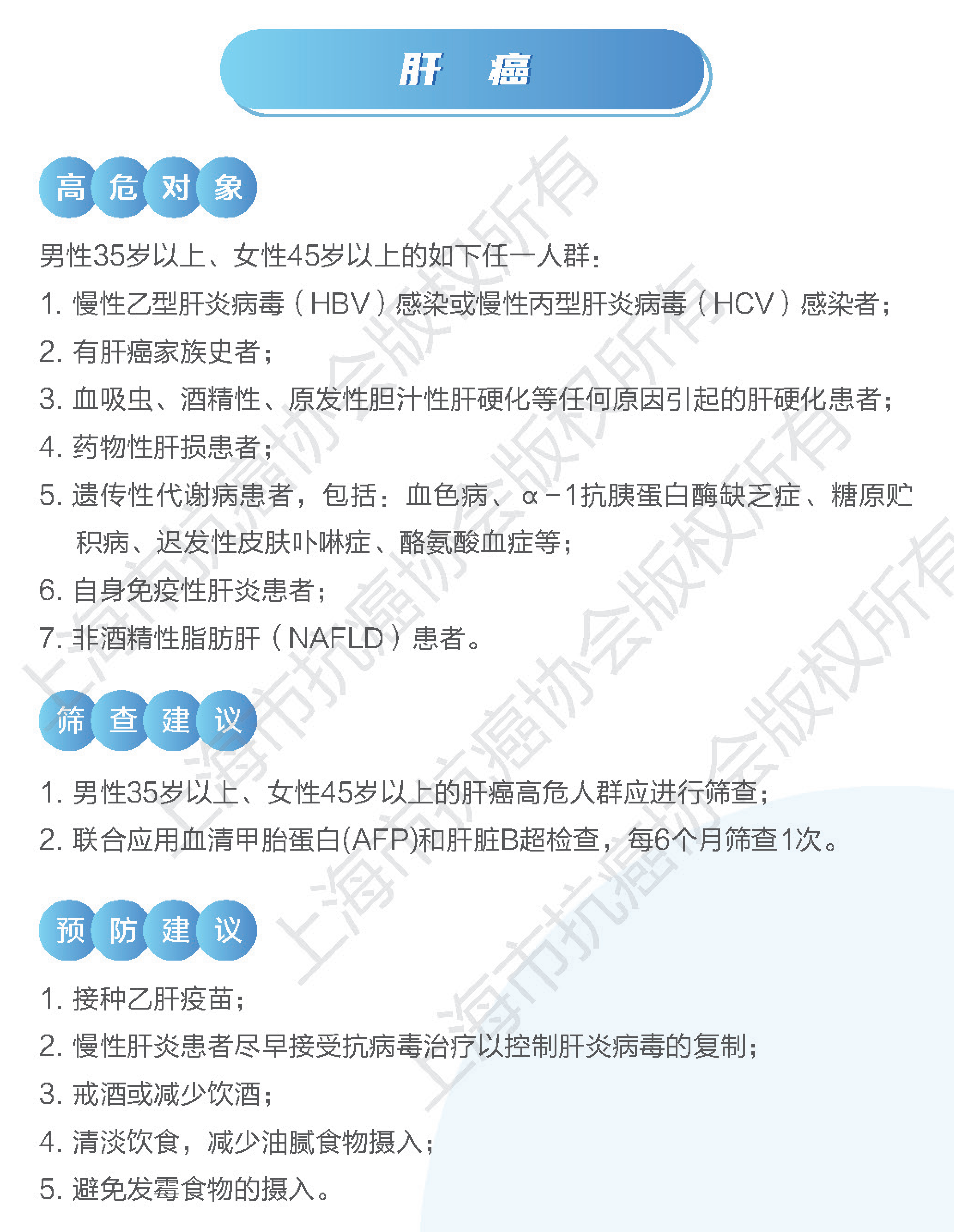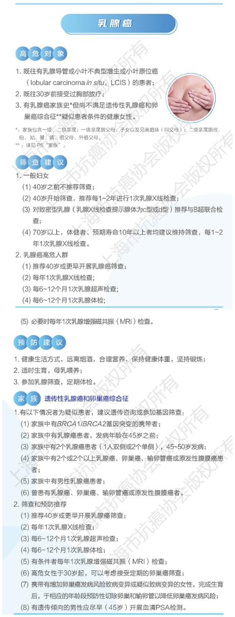 日前,上海市抗癌协会携手复旦大学附属肿瘤医院发布2022版《居民常见恶性肿瘤筛查和预防推荐》,涵盖20种常见癌症和遗传性肿瘤的预防筛查推荐,并首次新增“居民降低癌症风险的七大建议”,为个人在不同年龄、不同生活阶段的防癌早筛给出具体且有针对性的健康指导和筛查推荐。