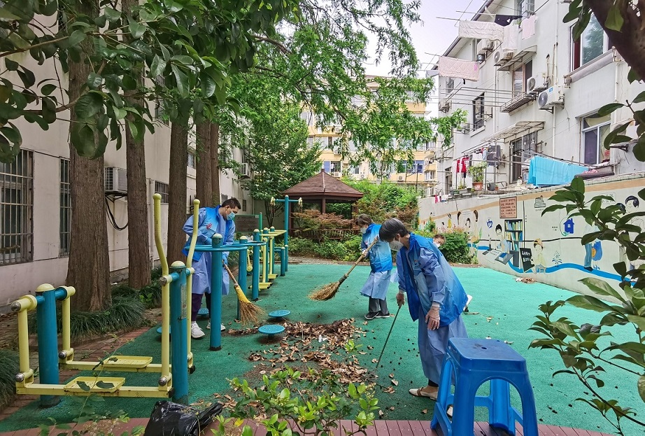 穿上防护服装,戴上手套,5月27日一早,漕河泾街道康健路77弄居民区里,一群“蓝精灵”的身影活跃起来,他们撸起袖子开启了“全民大扫除”模式。