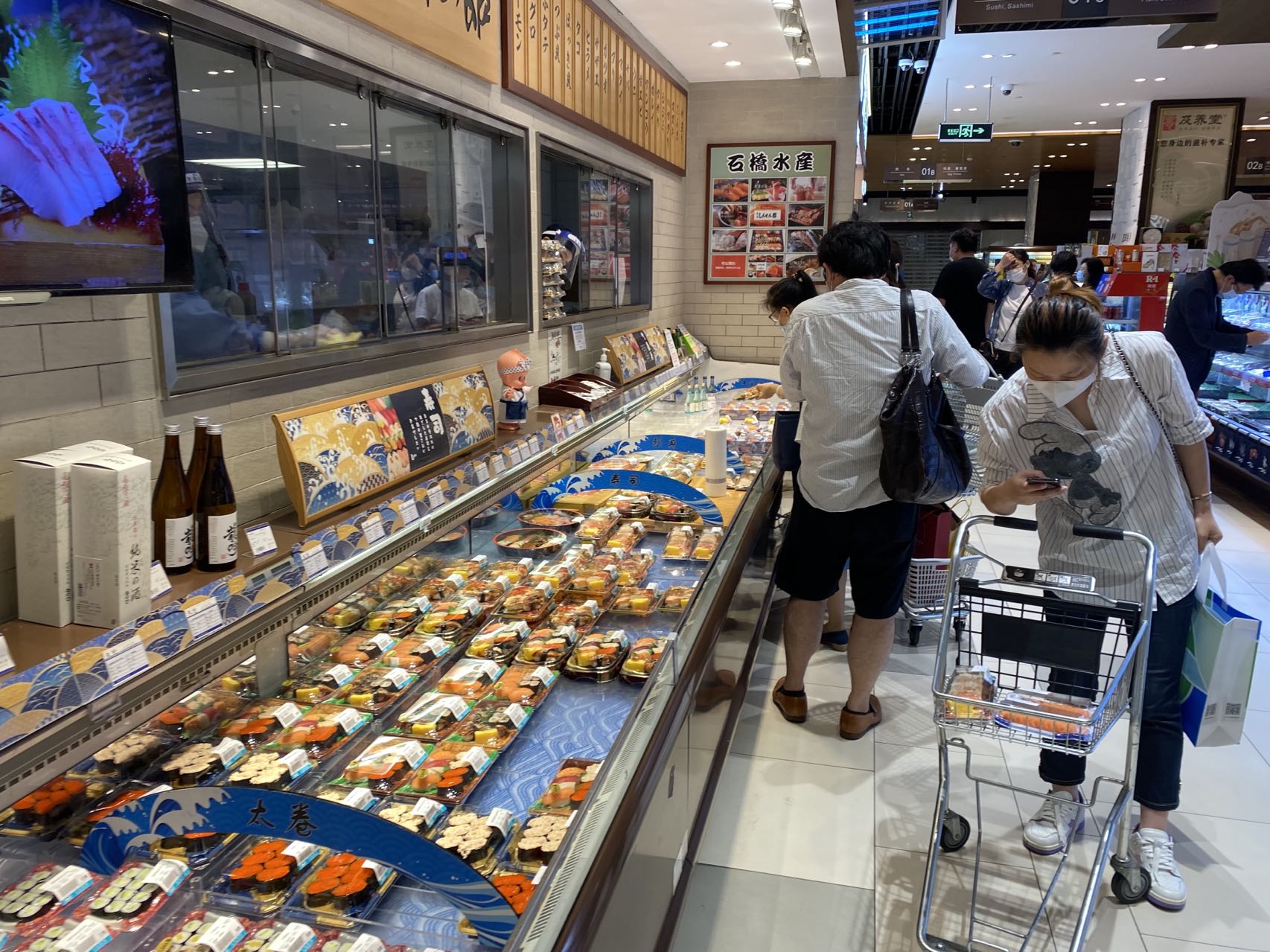 地下一层的精品超市,历来是上海市民的最爱,也是整个久光百货人气最旺的楼层。各种进口的饮料冷饮、休闲零食以及日用品,是今天消费者购买最多的品类,很多市民都把手推车装得满满当当。