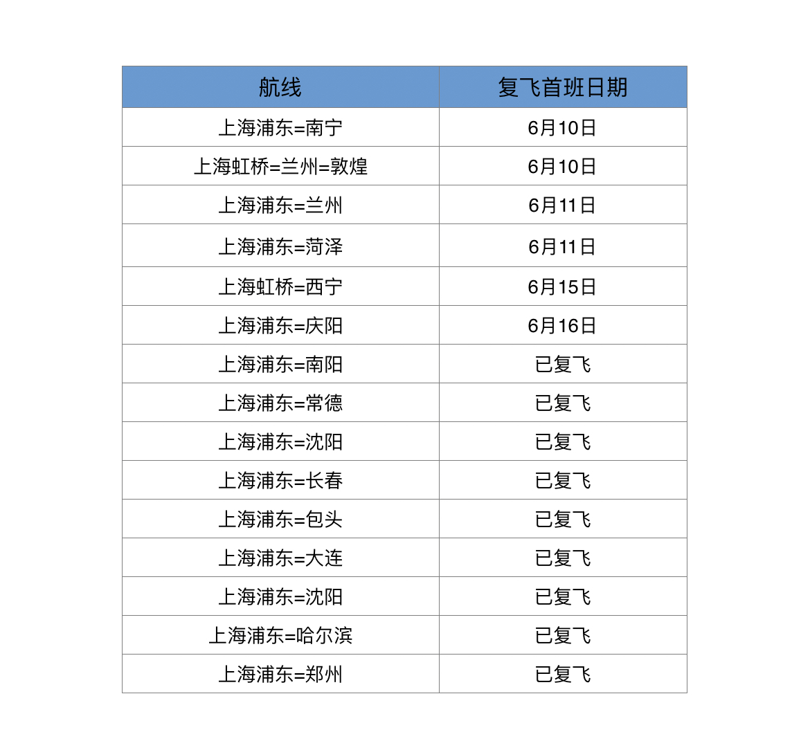 6月10日,春秋航空恢复上海虹桥T1-兰州-敦煌航线,航班号9C6137/38,航班恢复后为天天班,每天一班,执飞机型为空客A320。