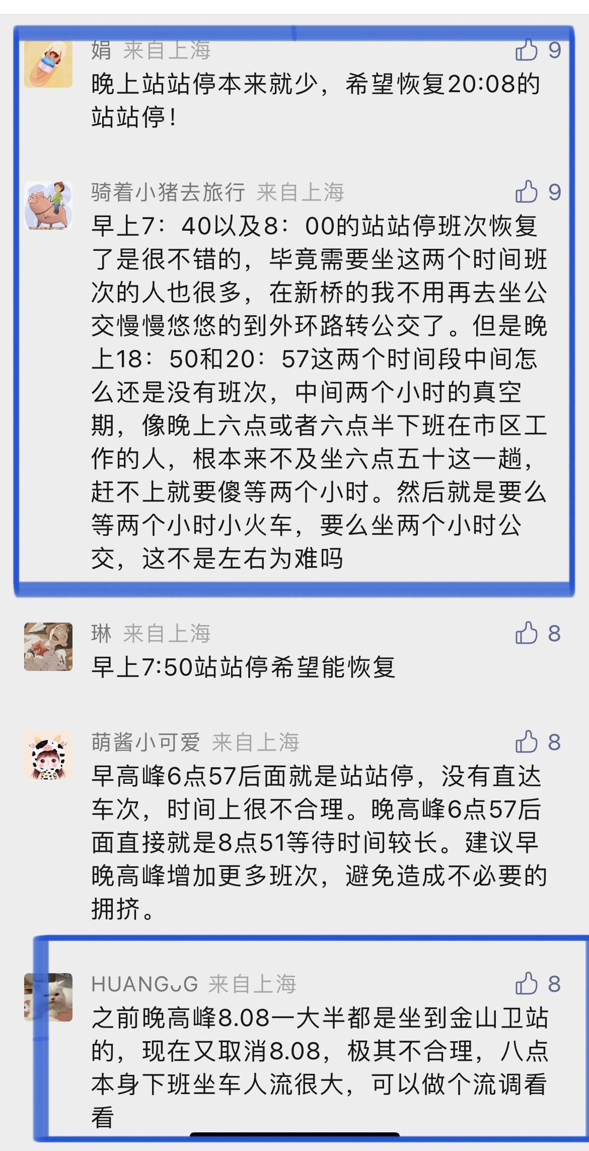 更有旅客直言:“金山铁路这时刻表有点不像通勤车,仿佛是观光旅游车”、“重要的上下班高峰时刻,车次那么少,间隔时间那么长”、“上海南站到金山卫,18:57分至20:51分之间,正是晚高峰时段,两个小时没有车,滞留乘客多,风险更高”……