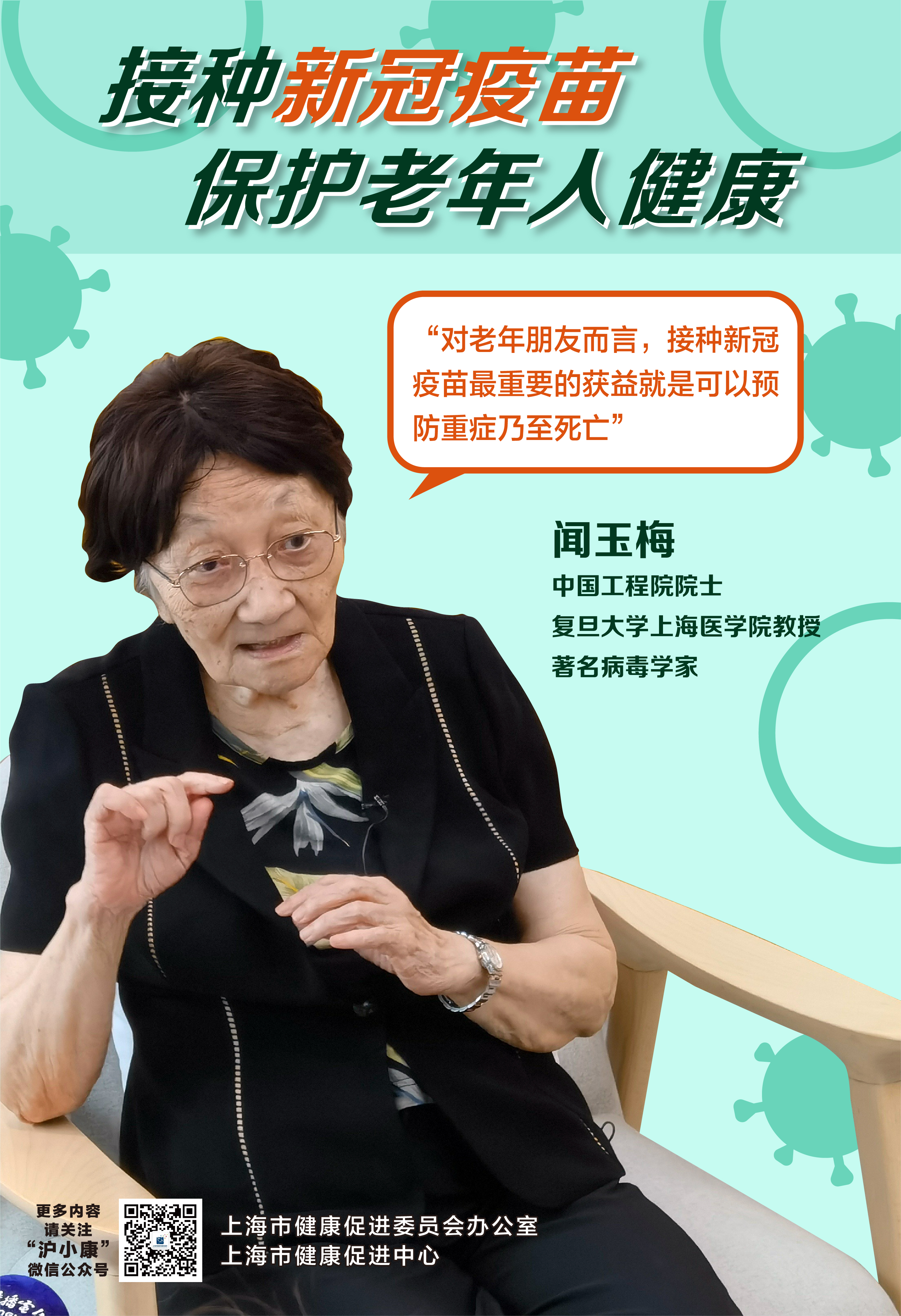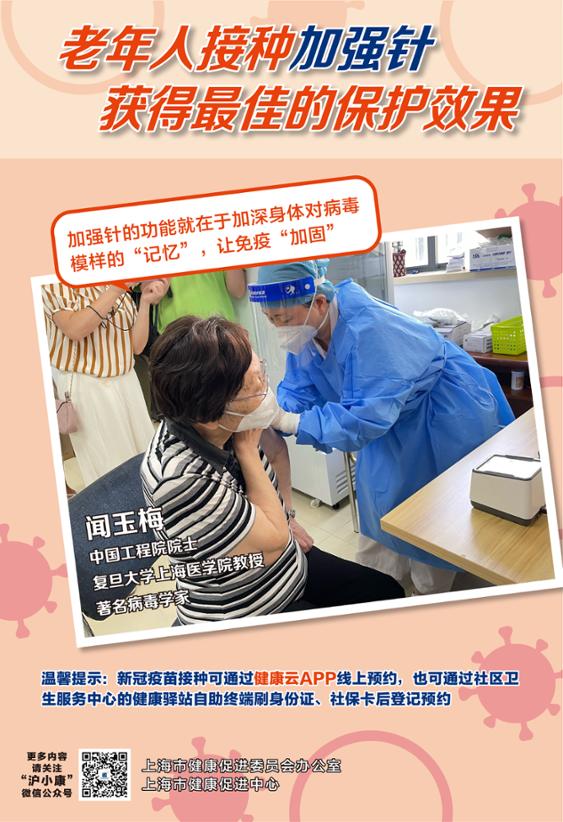 老年人为什么要接种新冠疫苗?有慢性病的老人可以接种新冠疫苗吗?针对老年人接种新冠疫苗的热点问题,市健康促进委员会办公室先后邀请中国工程院院士、复旦大学上海医学院教授、著名病毒学家闻玉梅,中国工程院院士、上海市第六人民医院内分泌代谢科贾伟平教授一一作答。不久前,89岁的闻玉梅院士在接种两针新冠疫苗后,还到社区卫生服务中心进行了新冠疫苗加强针的接种。