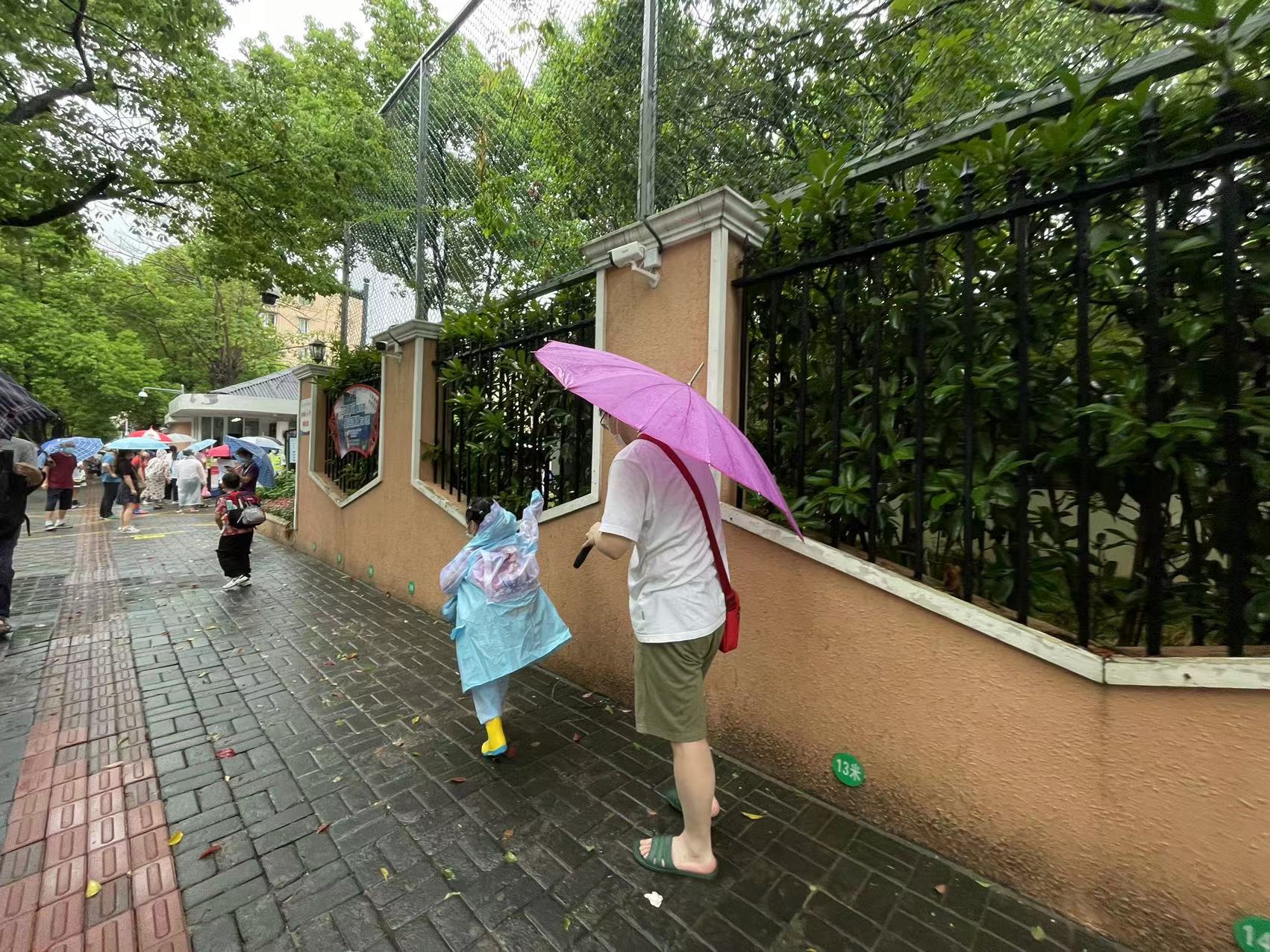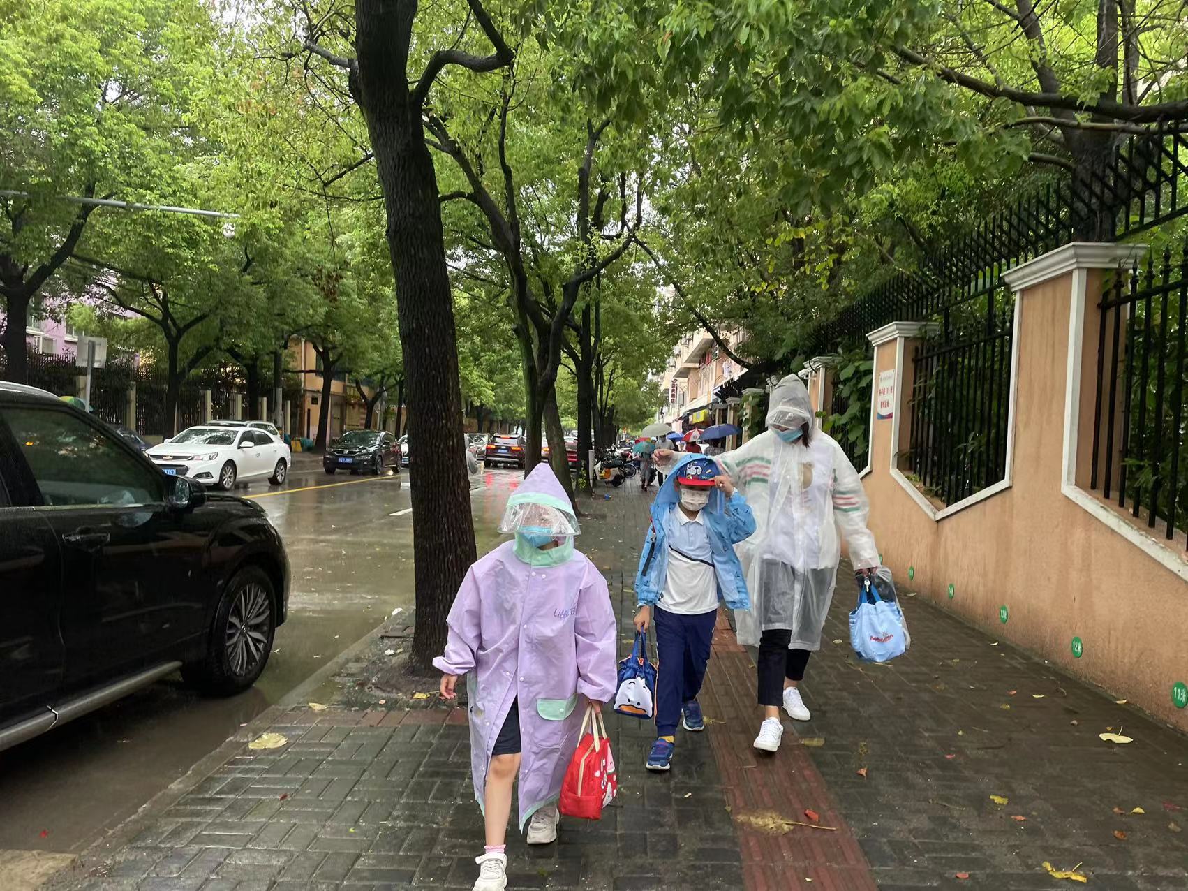 蹲下身再整理一下孩子的雨衣,拉一下雨帽,托一把书包,关照着孩子们各种注意事项。即便是亲眼看着孩子走进了校园,家长们还是不放心,依然站在校门外朝里张望着。