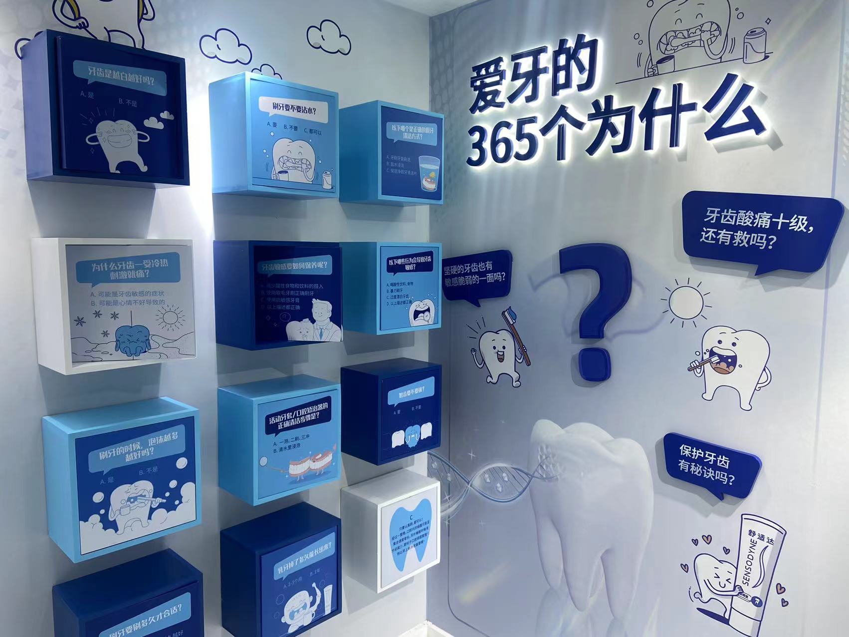 此次口腔健康科普展将从9月下旬延续至11月10日,设置了三大主题馆。场馆一“启·皓齿光境”是一个六边型光感镜面打造的炫酷通道,戴上炫光眼镜,视觉无限延伸,畅享被360°未来科技感立体环绕的绝佳体验。在场馆二“觅·慧牙之门”,这里有“爱牙一整天”从早到晚24小时牙齿护理小知识,通俗易懂;墙上还配有牙宝漫画问答盒的趣味互动设计,带小朋友的家长尤其不可错过。场馆三“遇·欢笑人生”则提供了进阶体验,这里设置了护齿问诊区,观众将在牙科专业人士指导下进行口腔检查,每周还将有牙科专业人士在这里提供专业意见。