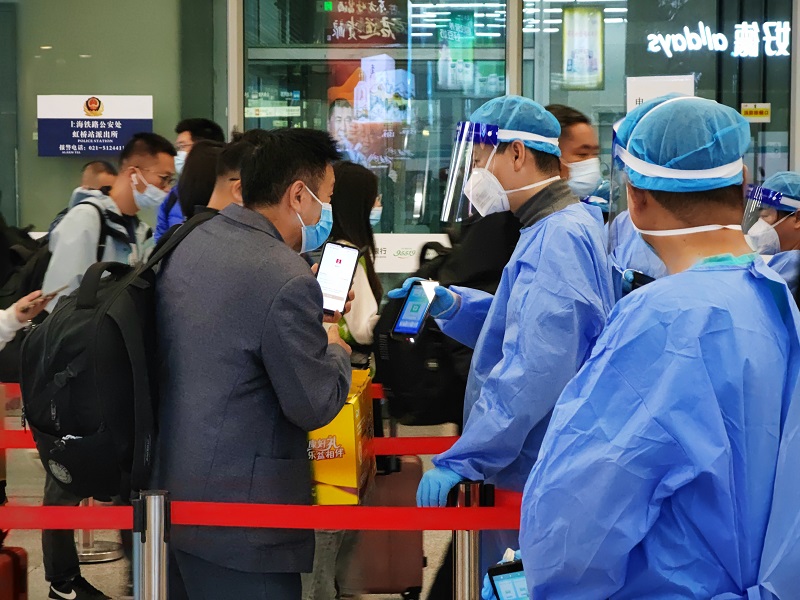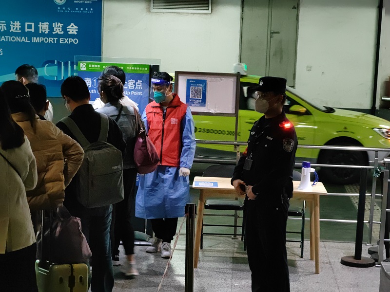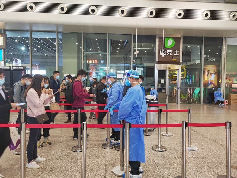 对于坚守在虹桥站的防疫人员来说,压力不小。中午时分,随着抵沪列车到站,一批批旅客从站内出站,抵达虹桥站的到达层。