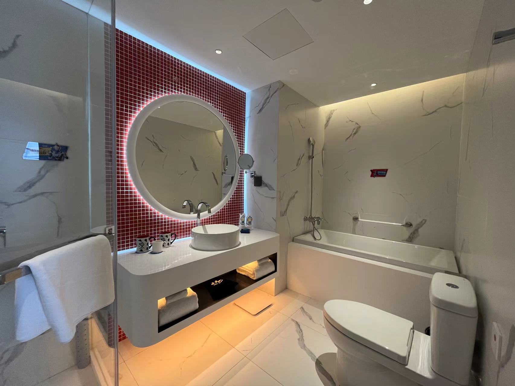 试营业当天,记者见到,房间里全细节圆角设计、儿童版浴缸等充分考虑亲子互动的体验性、安全性,也满足全年龄段的粉丝需求。“一进房间,我就被上下铺的奥特曼指示灯圈吸引了,我感觉躺在床上就像睡在了奥特星球。不仅如此,我也注意到墙上有很多奥特曼知识的科普,洗手间摆放了奥特曼的漱口杯,衣柜里也有奥特曼的拖鞋,细节满分。”首日前来尝鲜的一位住客感慨道。