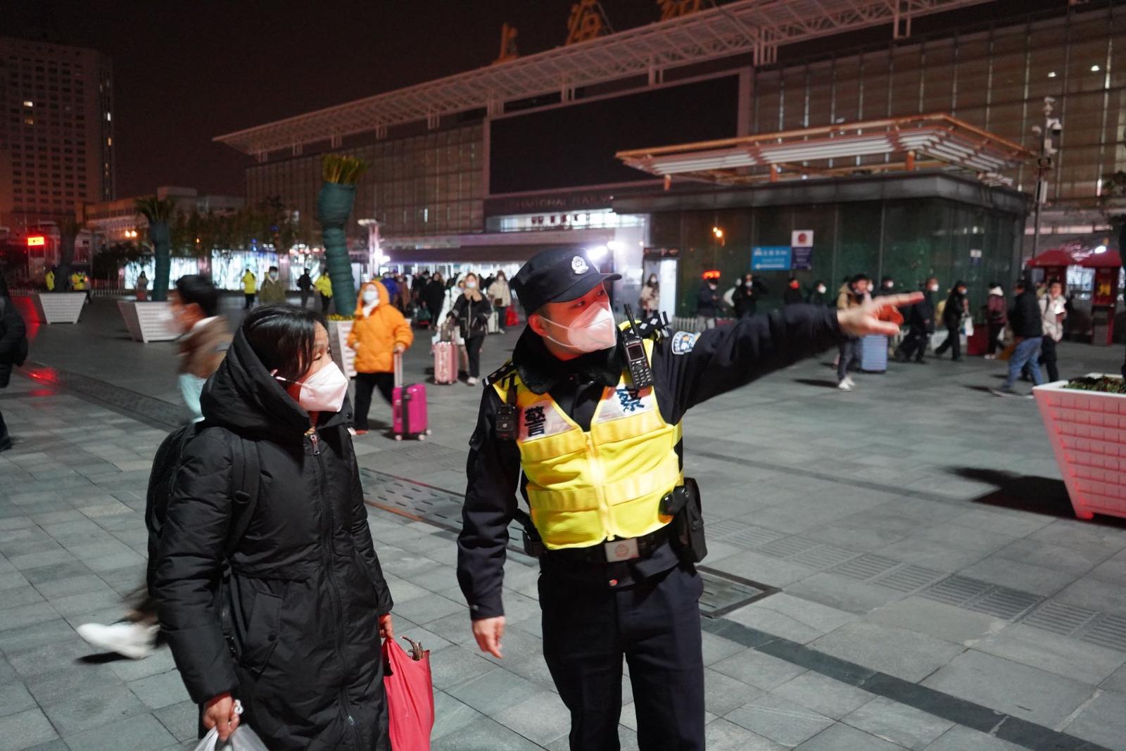 上午10时许,在上海火车站北广场西北侧出口,上海站地区治安派出所民警王予泽正引导旅客有序出站。