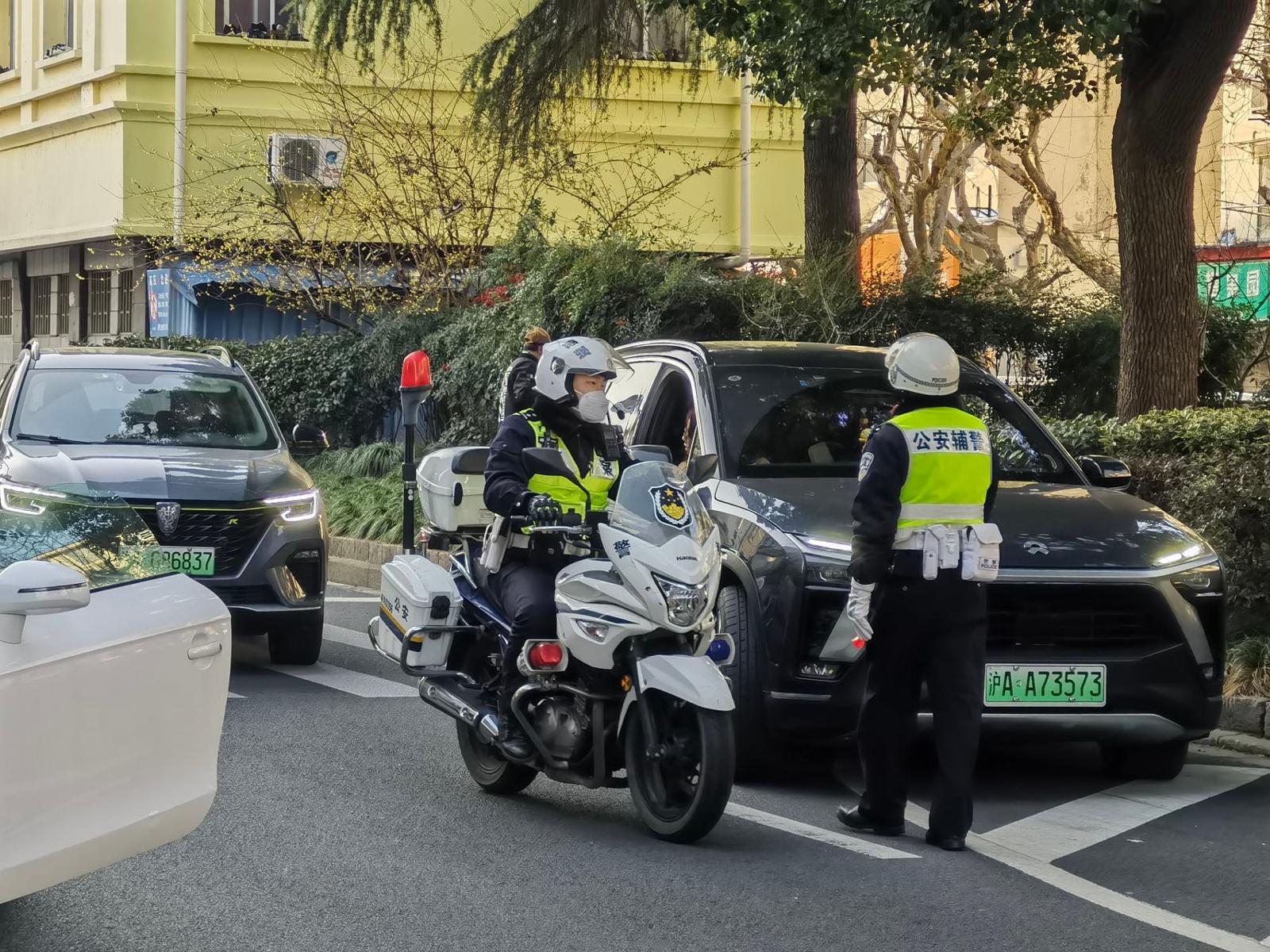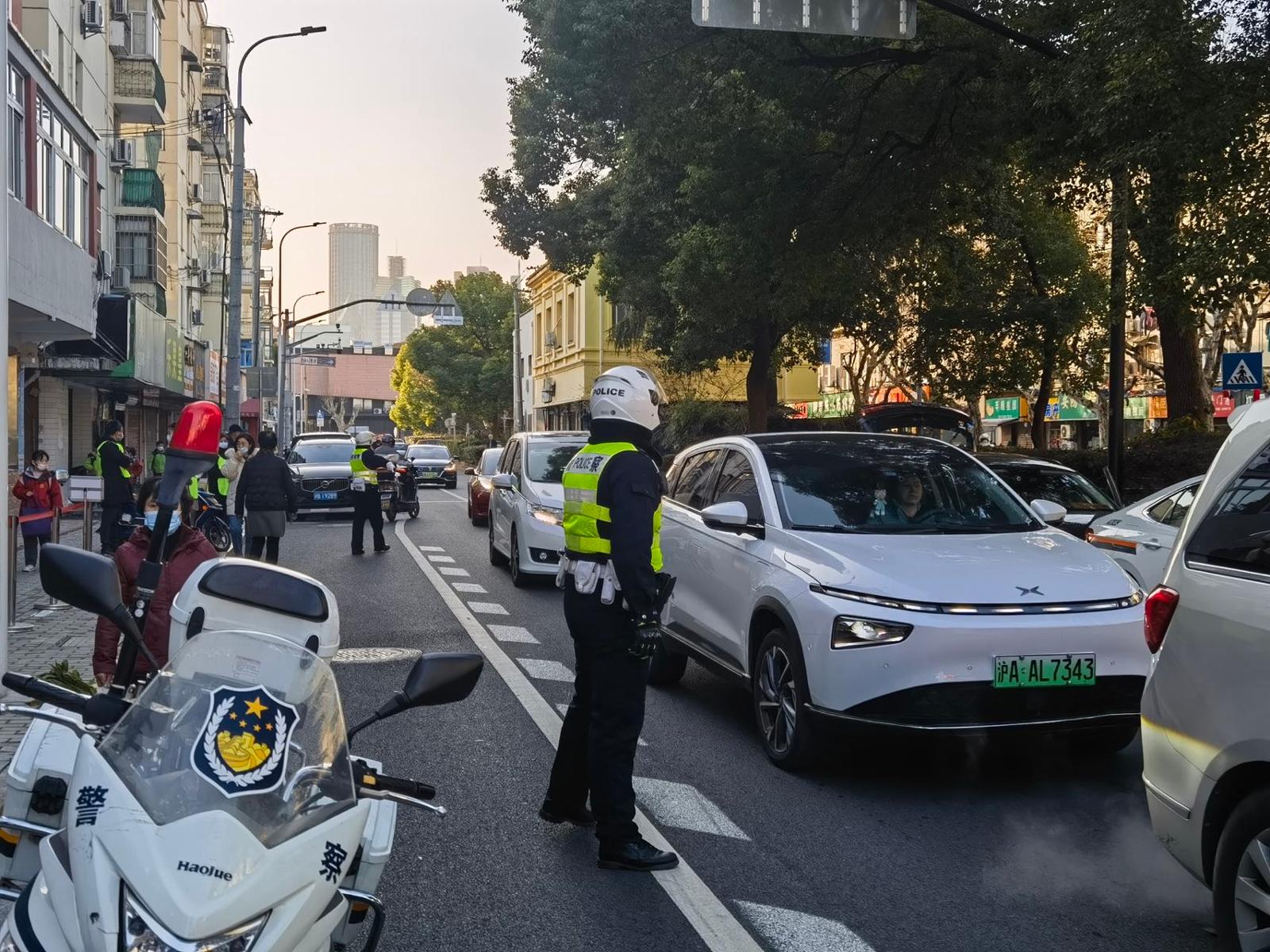 (静安交警有序引导校门口车流)