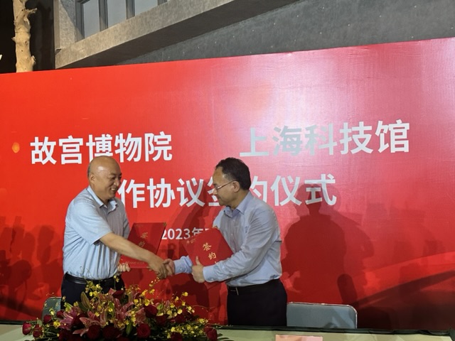 7月14日,故宫博物院与上海科技馆签约仪式暨跨界对谈活动在上海自然博物馆(上海科技馆分馆)举行,故宫博物院院长王旭东和上海科技馆馆长倪闽景代表双方签署战略合作协议。
