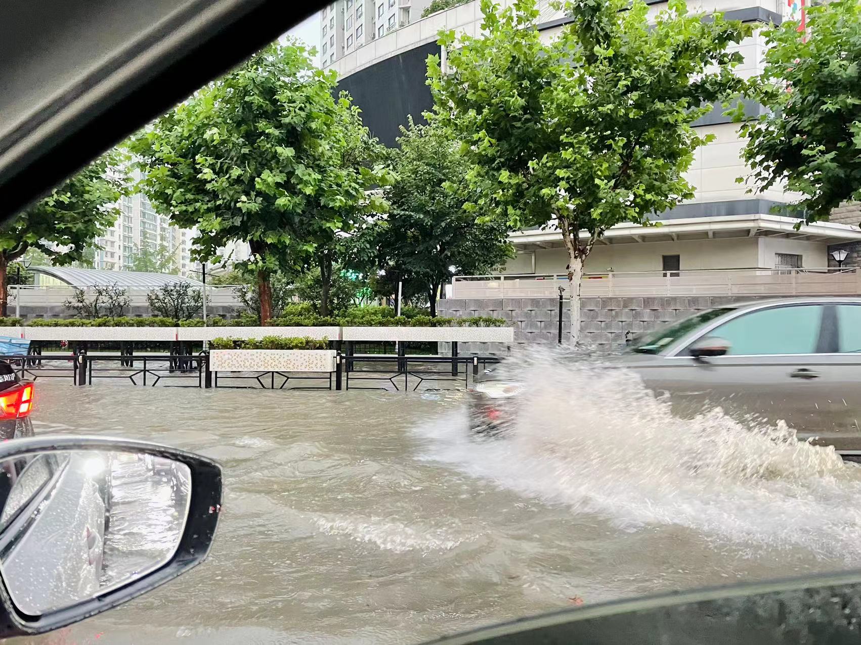 在朋友圈,几乎随处可见各种蹚水“过河”的场景,机动车行驶在大片的积水里,溅出朵朵水花。因为瞬时降水量实在太大,道路排水系统根本来不及同步运作,导致包括高架、道路等多方位的城市通行区域受到积水影响。