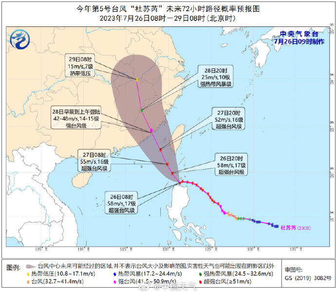 今年第5号台风“杜苏芮”已在24日晚上加强成为超强台风,预计它将于今天(7月26日)夜间到明天早晨移入南海东北部,然后逐渐向福建福清到广东惠来一带沿海靠近,并将于28日早晨到上午在上述沿海地区登陆,最大可能以强台风级在福建晋江到闽粤交界沿海登陆。