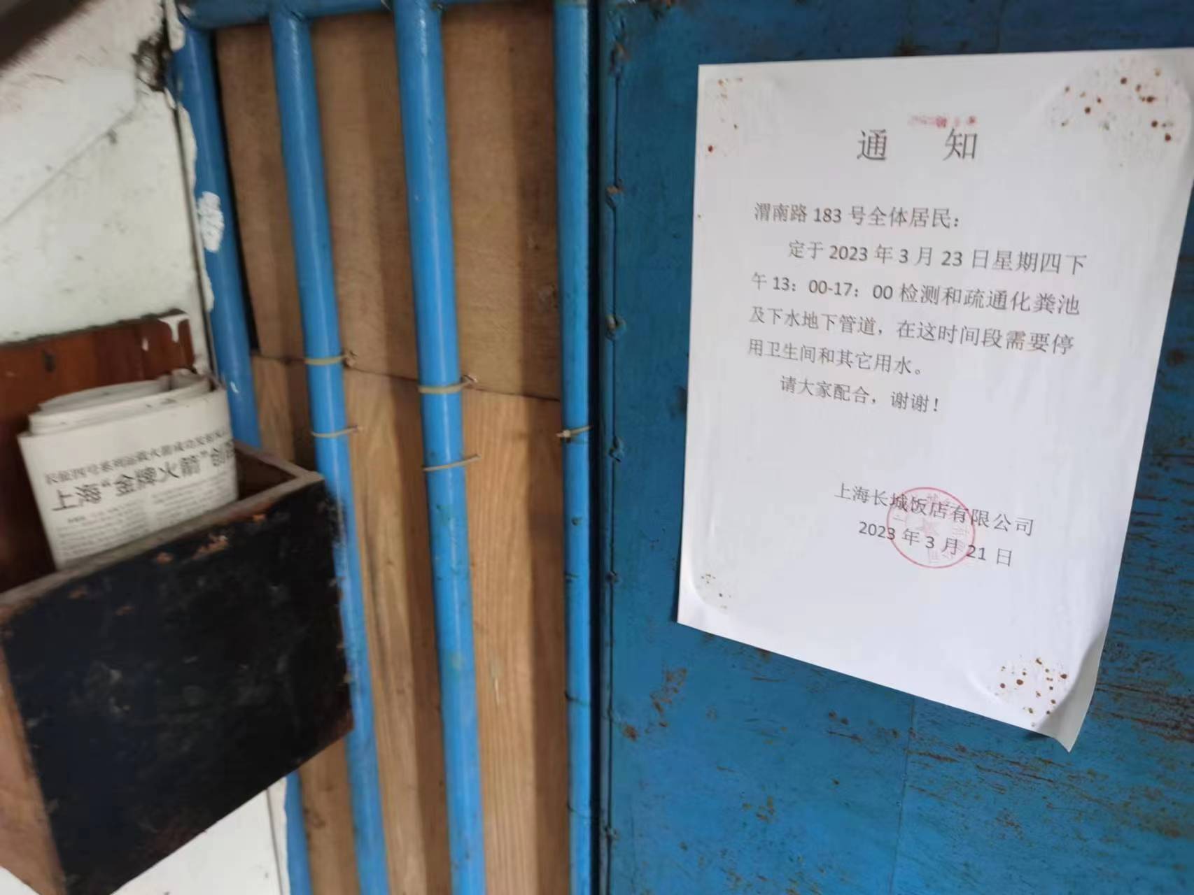 记者实地探访也发现,上海长城饭店有限公司曾贴出告示,于今年3月23日对小区进行了检测和疏通化粪池及下水地下管道。不过,居民们指出,5个月过去了,眼看着化粪池又要满了,不免很担心。