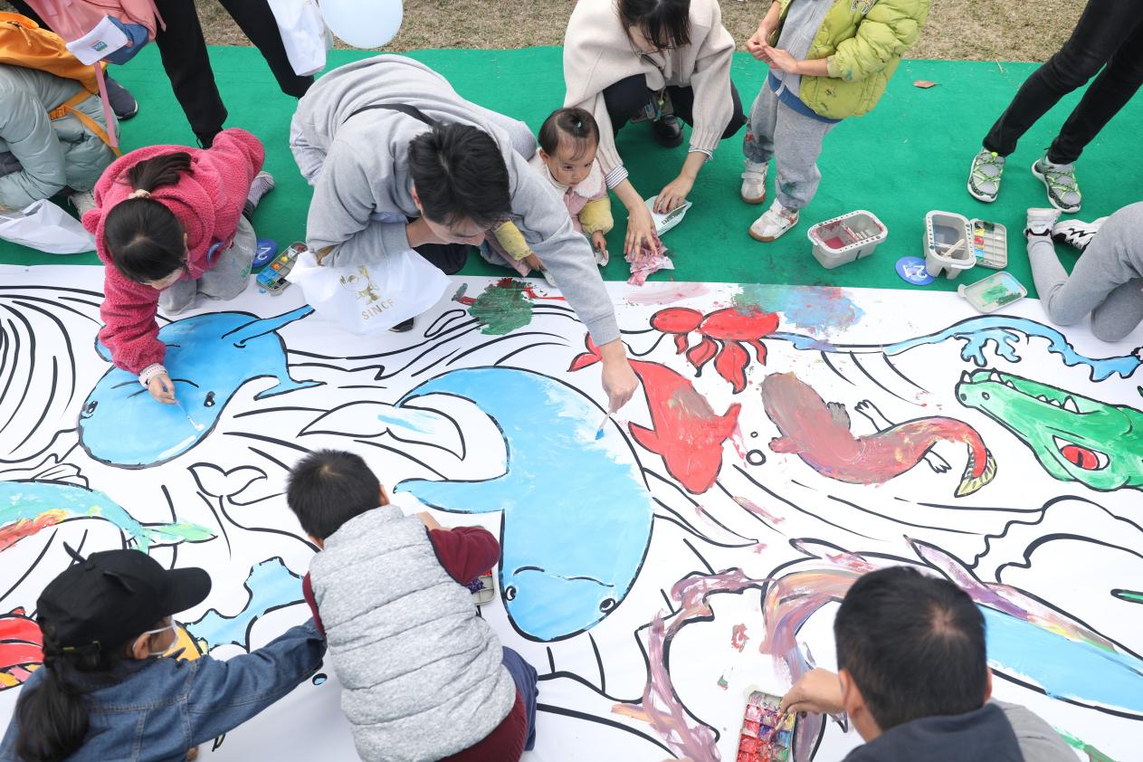 本次活动特别设计30米生态画卷,包含上海市及长宁区生态地标、长江旗舰物种、全球多样生态,通过市民共绘的方式生动演绎人与自然和谐共生理念。孩子们在画卷上尽情涂抹挥洒,或蹲着、或趴着、或坐着,姿态各异,神情专注而认真。不一会儿,画卷被一幅幅风格迥异、充满童真的作品填满,承载着小朋友们对“人与自然”关系的理解和对美丽家园建设的展望。