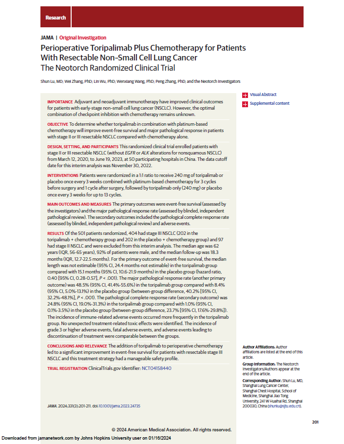 有没有可能打破这样的困境,为更多的患者探寻“逃生通道”,提升远期生存率和生命质量?由陆舜教授领衔的全国多中心团队进行了名为Neotorch的研究,开始探寻肺癌围术期免疫治疗新模式。研究在全国56家中心开展,共纳入501例II期、III期非小细胞肺癌患者。结果显示,相较单纯化疗,特瑞普利单抗联合化疗可显著延长患者的无事件生存期(患者的疾病没有进展、没有发生并发症的生存时间),将患者的疾病复发、进展或死亡风险降低60%,总生存期也有明显的获益趋势。同时,特瑞普利单抗组的近一半的病人达到主要病理缓解率(治疗后癌细胞只有原来的10%)和四分之一的病人完全病理缓解率(治疗后没有癌细胞),分别高达单纯化疗组的6倍和25倍。