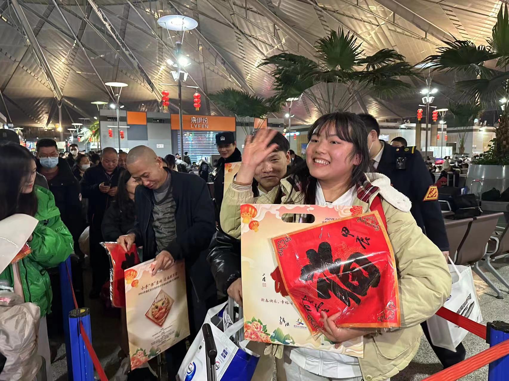 头图为候车室内,乘务人员为旅客送上新春“福”字欢送他们上车。铁路部门供图