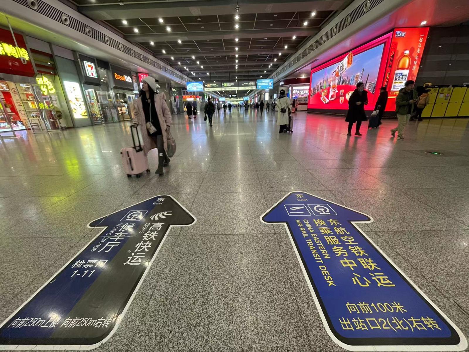 在上海虹桥站到达层的地面可以看到前往联运换乘服务中心的标识。劳动报记者 包璐影 摄影
