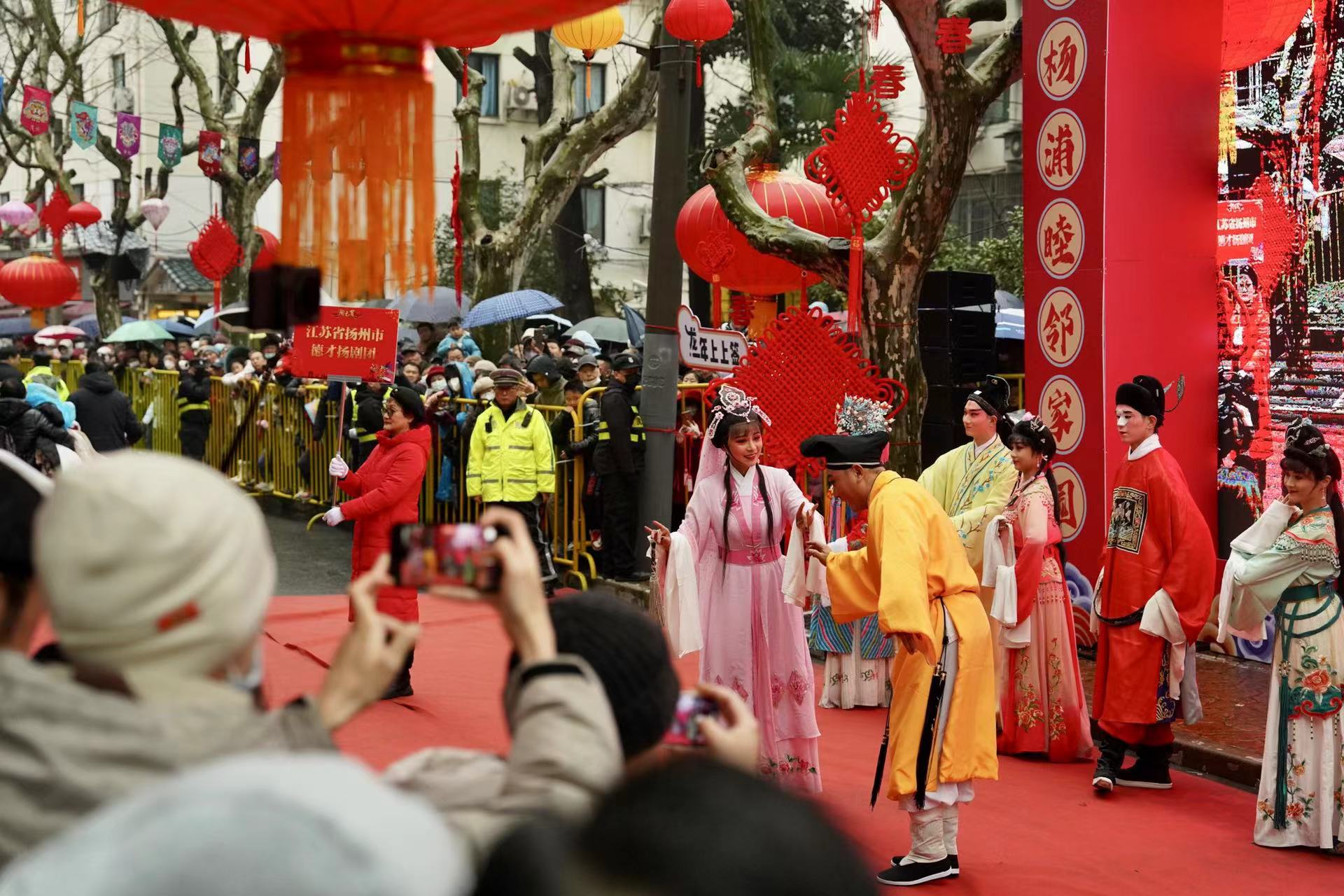 在行街队伍中,除了上海本地非遗队伍外,长三角非遗团队也相聚于此。安徽“五马破曹”、江苏德才扬剧、浙江南浔船拳,还有社区秧歌腰鼓、福禄寿喜、汉服表演......苏家屯路两旁人山人海,热闹非凡。市民们或拍照片、或摄视频,随着行街队伍的精彩表演,欢呼声此起彼伏,掌声不断。