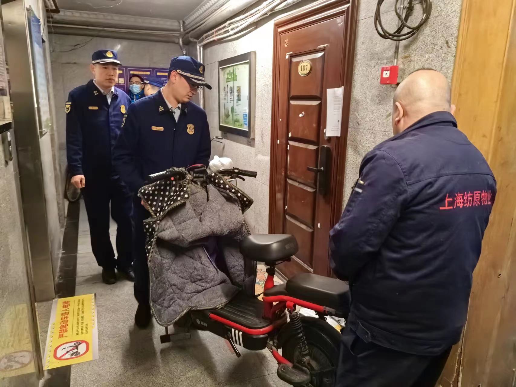 头图为长宁消防防火监督员与物业工作人员一起将停放在楼道内的电动自行车搬离。劳动报记者 包璐影 摄影
