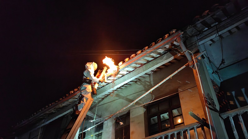 为防止处置过程中蜜蜂四处乱窜对周边的群众造成伤害,救援人员首先疏散群众至安全区域,并做好现场警戒。随后,救援人员穿戴好防蜂服后,架设金属拉梯攀爬至蜜蜂窝旁,使用杀虫剂进行“火攻”处置。为避免漏网蜜蜂再次“安家”,救援人员持续对残留的蜜蜂窝及掉落的蜜蜂喷洒杀虫剂,成功排除“蜂”险。