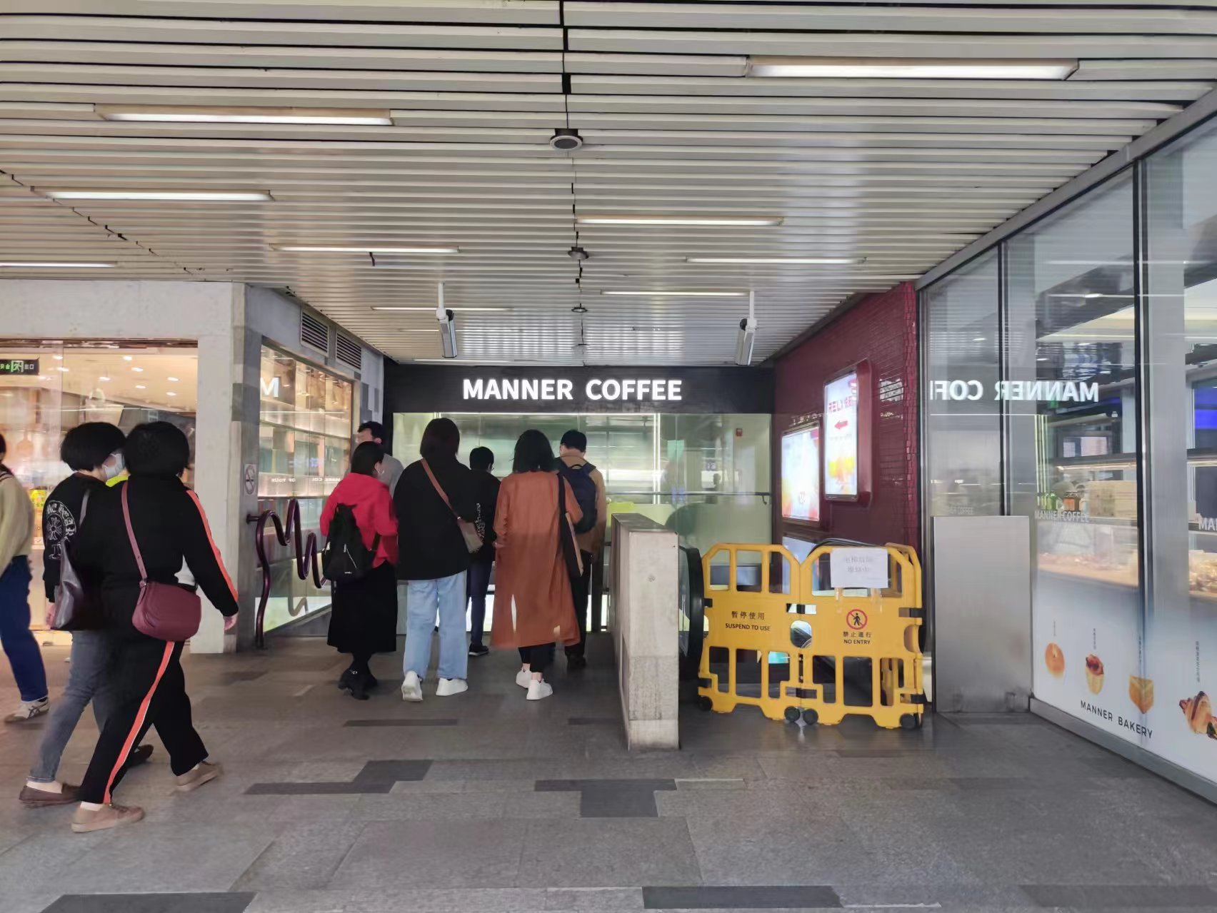 笔者在现场查看发现,截至发稿时,在2号线南京西路地铁站3号出口,自动扶梯前仍然挂着“禁止通行”的黄色警示牌,牌上张贴着“电梯故障维修中”的字条,并未注明维修原因与维修起止时间。由于3号口出站便是吴江路步行街,人流量较大,步行出入站的乘客络绎不绝,亦有前来游玩的旅客提着行李缓慢前行。
