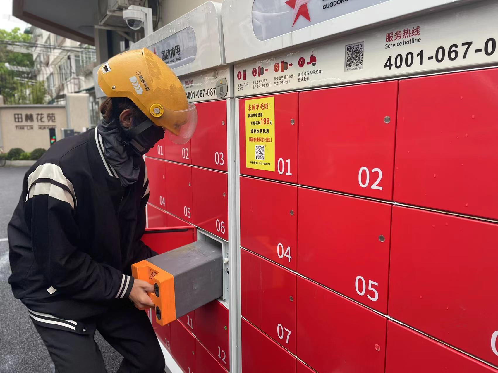 翻开电动自行车座椅取出电池、拿出手机扫码归还电池、从换电柜取出新电池安装……外卖骑手小刘的整套动作行云流水,不超过2分钟。这是记者4月12日在徐汇田林花苑看到的一幕。