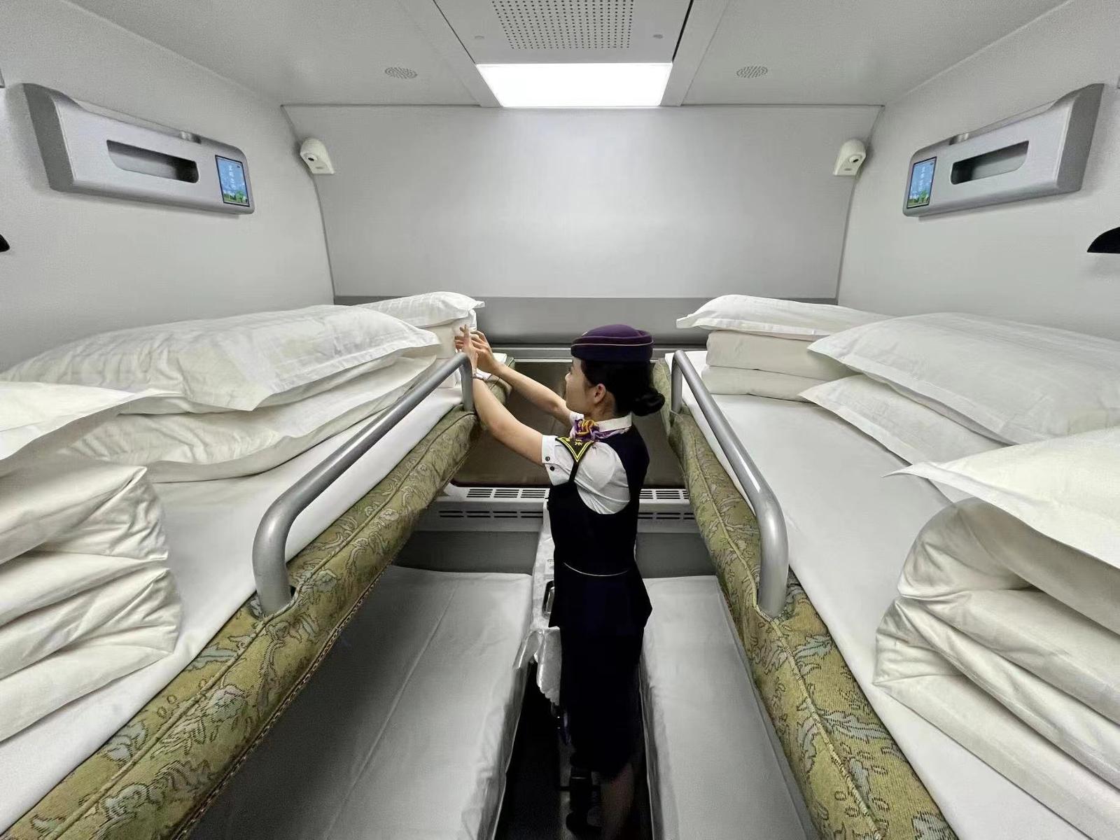 “我们这趟车一共配备了2个二等座车厢、1个餐车,以及13个动卧车厢。”蔡海燕告诉记者,其中,还包括了1个高级软卧,“里面自带衣帽间、沙发和行李柜。”