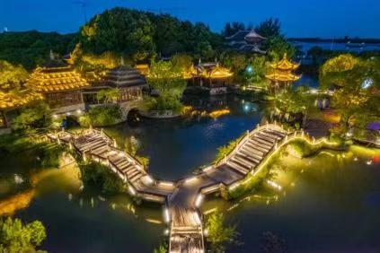 夜幕低垂,星光闪烁,水博园在夏夜绽放出了别样的光彩。灯光秀和技术将整个江南古典园林转变为巨大的视觉艺术画布,披上了层层光影。黄浦江边的古桥、古树、古建筑作为水博园的特色元素,新增了立体多维体验场景,给游客呈现出了一场令人印象深刻的夜色穿越之旅,使夜间游览变得更加生动有趣。