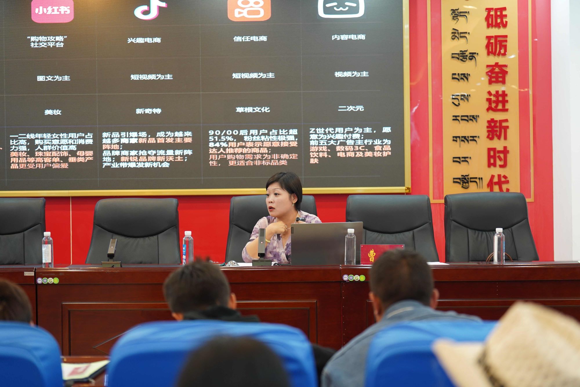 此次培训内容涵盖了新媒体营销的现状分析及发展趋势,选品和文案策划,短视频制作和直播带货等内容。授课老师们结合行业内的真实案例进行分析,在真实开播的场景下帮助学员灵活应用所学知识,提升实际操作能力。