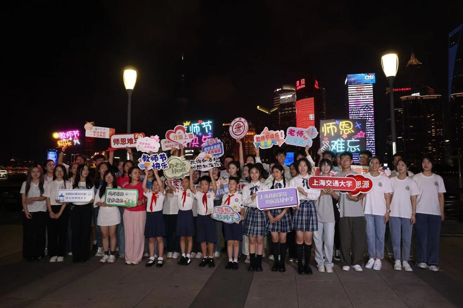 当晚,来自复旦大学、上海交通大学、同济大学、华东师范大学、上海音乐学院、上海体育学院、上海公安学院、上海戏剧学院附属高级中学、上海市黄浦区卢湾一中心小学等学校的学生代表,来到外滩亲水平台举行教师节祝福活动。同学们以即兴表演、录制微视频、拍摄创意照片等方式,为亲爱的老师们送上深深的敬意和节日的祝福。活动吸引了外滩平台上的游客们纷纷驻足观看拍照,并以此为背景为自己的老师录制祝福视频。