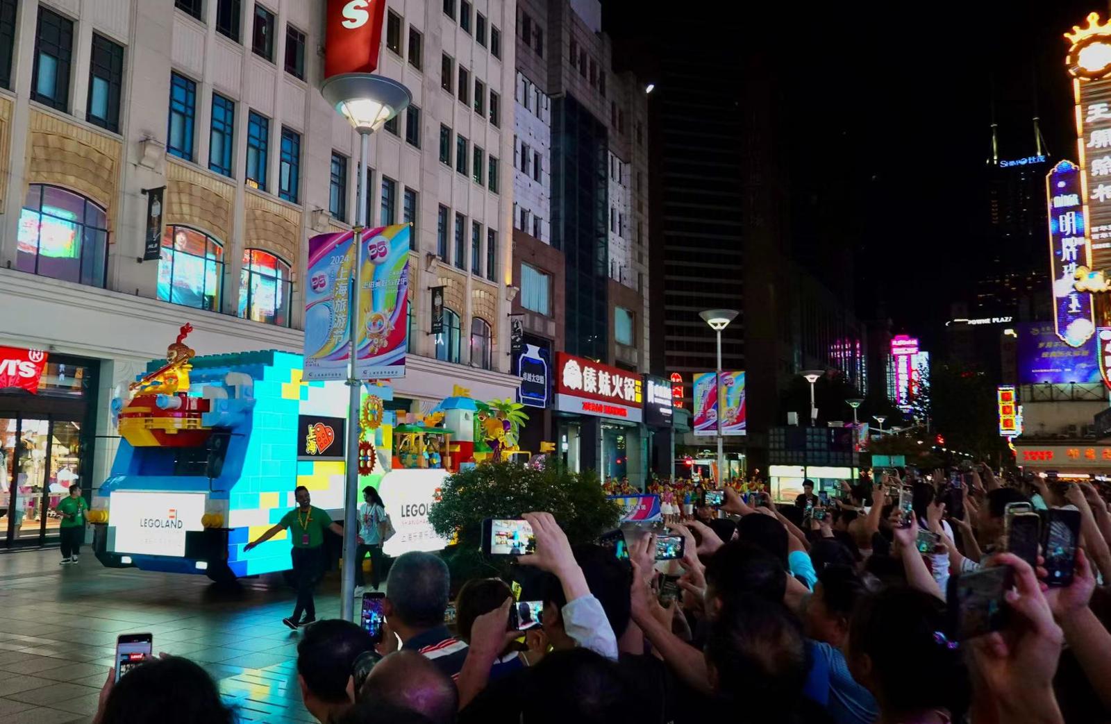 入夜的南京路步行街,华灯璀璨,2024旅游节开幕大巡游精彩上演。9月14日晚,25支表演方队和25辆绚烂花车集中亮相。充满特色的演出,多元文化的展示,把“中华商业第一街”变成了欢乐缤纷的海洋、流光溢彩的世界。