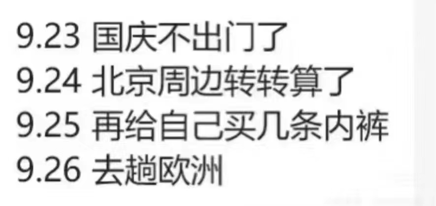 还有人吐槽了自己的心路历程——9月23日:国庆不出门;9月24日:去贵州、云南还是新疆?9月25日:经济舱太挤,还是头等舱舒服;9月26日:飞欧洲的机票这么便宜;9月27日现在去夏威夷办签证要几天?