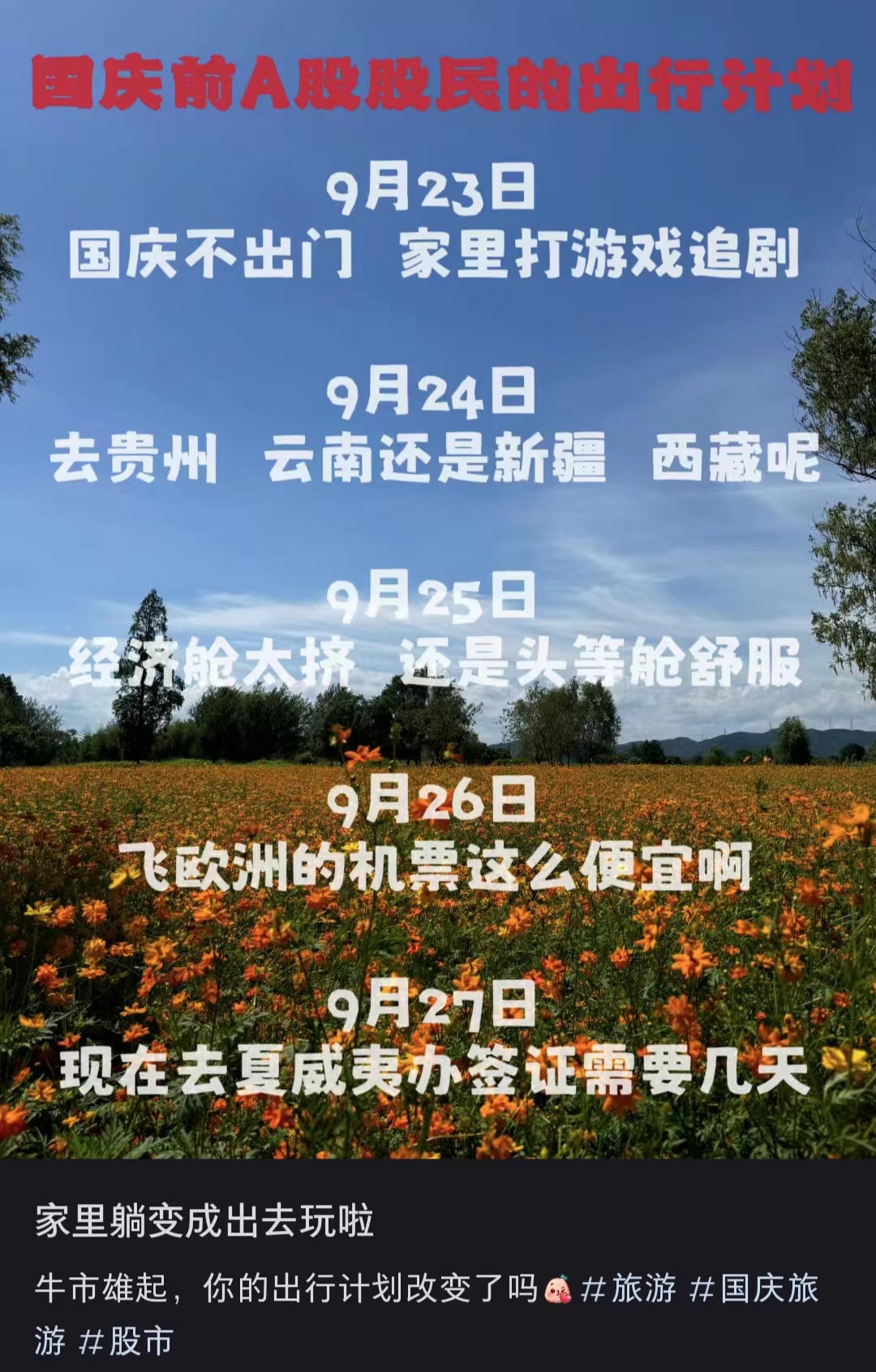 虽然有些是玩笑话,但是股市大涨确实给了人们出游的底气,很多人称自己国庆将从“家里躺”的状态切换成“出门玩”。