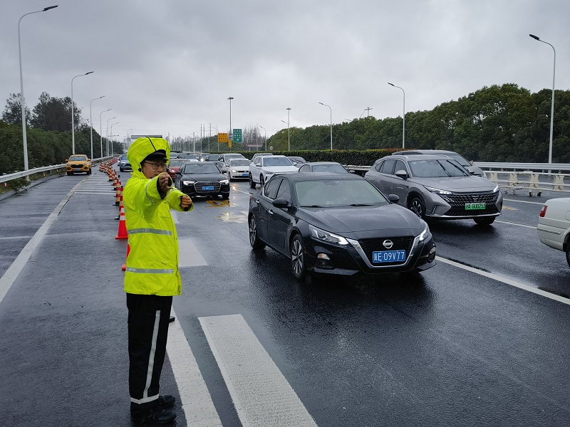 “雨天路滑,注意减速行驶。”“前方车辆缓行,请耐心行驶。”崇明警方增派警力手持警用喇叭,在汇入主路的各个路口,以及陈海收费口、潘圆收费口展开限流疏导工作,防止车流快速激增。记者在交警指挥大屏幕上看到,G40下行线陈海限流点以及长兴服务区限流点开始限流。