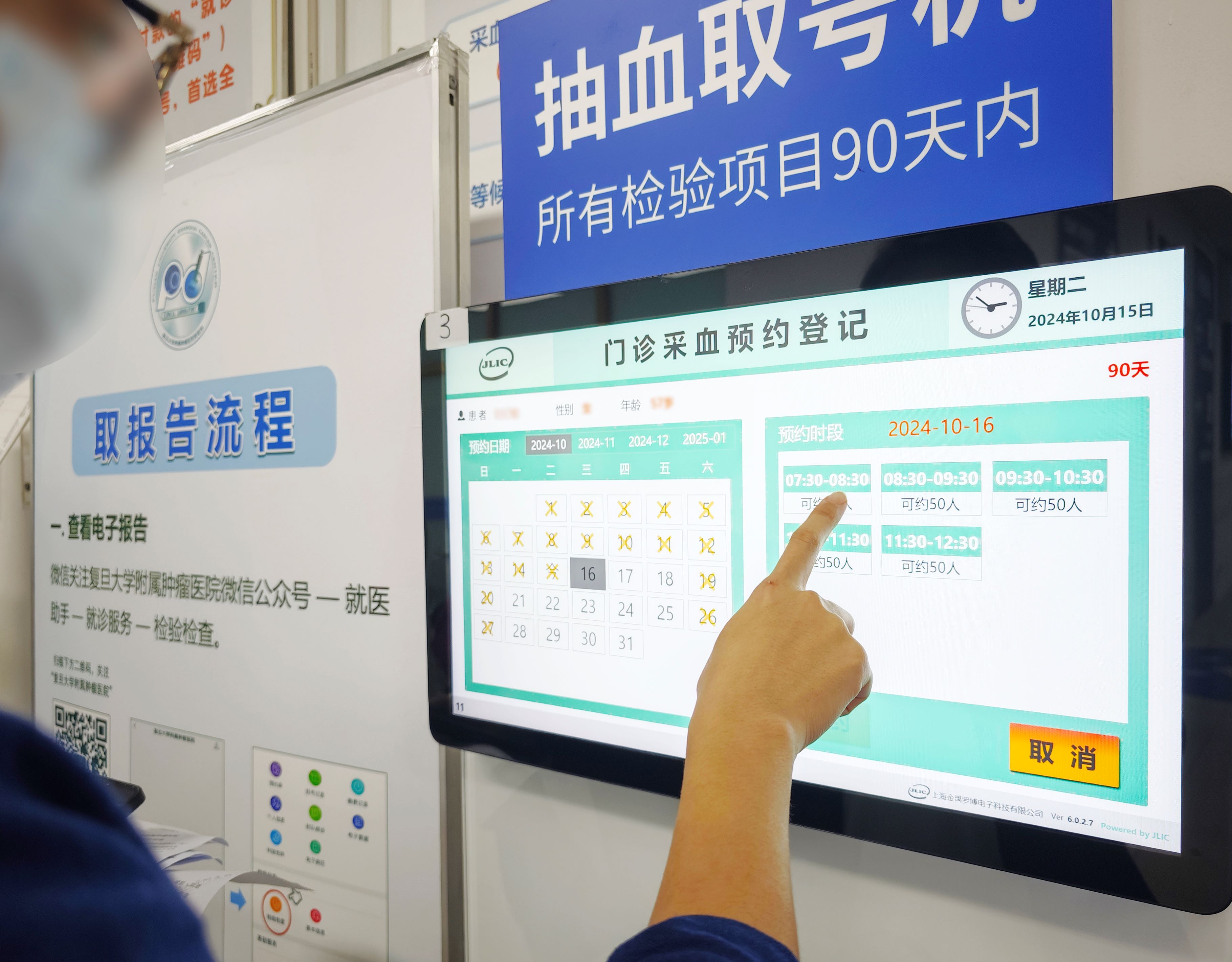 头图为患者在进行门诊采血预约登记。肿瘤医院供图
