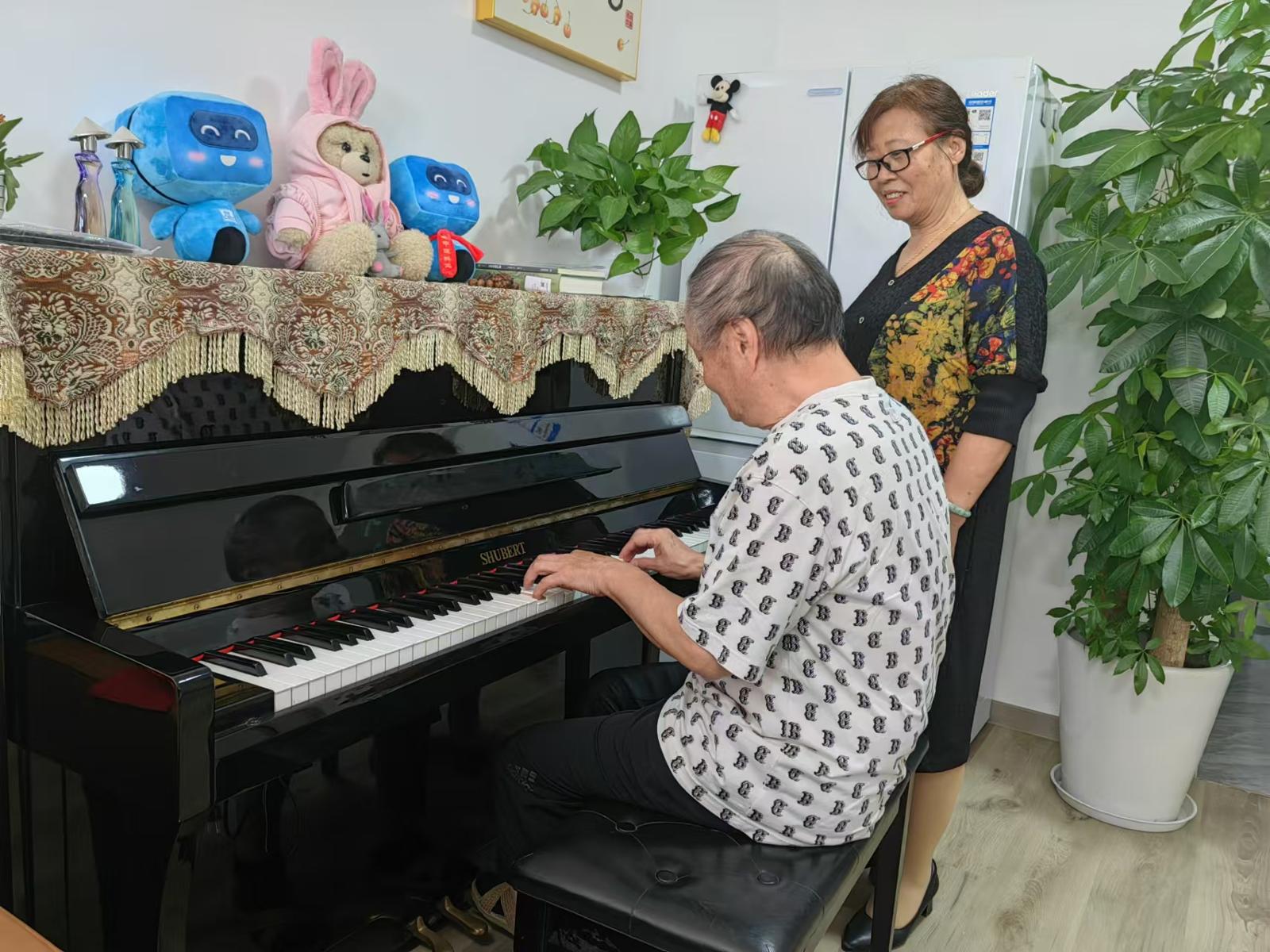 何培哲在焕然一新的家中弹奏钢琴。于玘珺 摄影