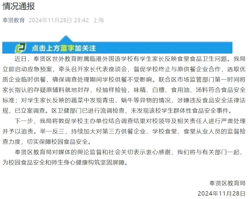 奉贤区教育局表示,该局立即启动应急预案,牵头召开家长代表座谈会,督促学校终止与原供餐企业合作,选取优质企业临时供餐,确保调查处理期间学校供餐不受影响。联合区市场监管部门第一时间将家长指认的存疑原辅料就地封存,经抽样检验,味精、白糖、食用油、汤料符合食品安全标准;对学生家长反映的蔬菜中发现青虫、蜗牛等异物的情况,涉嫌违反食品安全法律法规,已立案调查。区卫健部门已进行流调检查,未发现该校学生群体性食品安全事件。