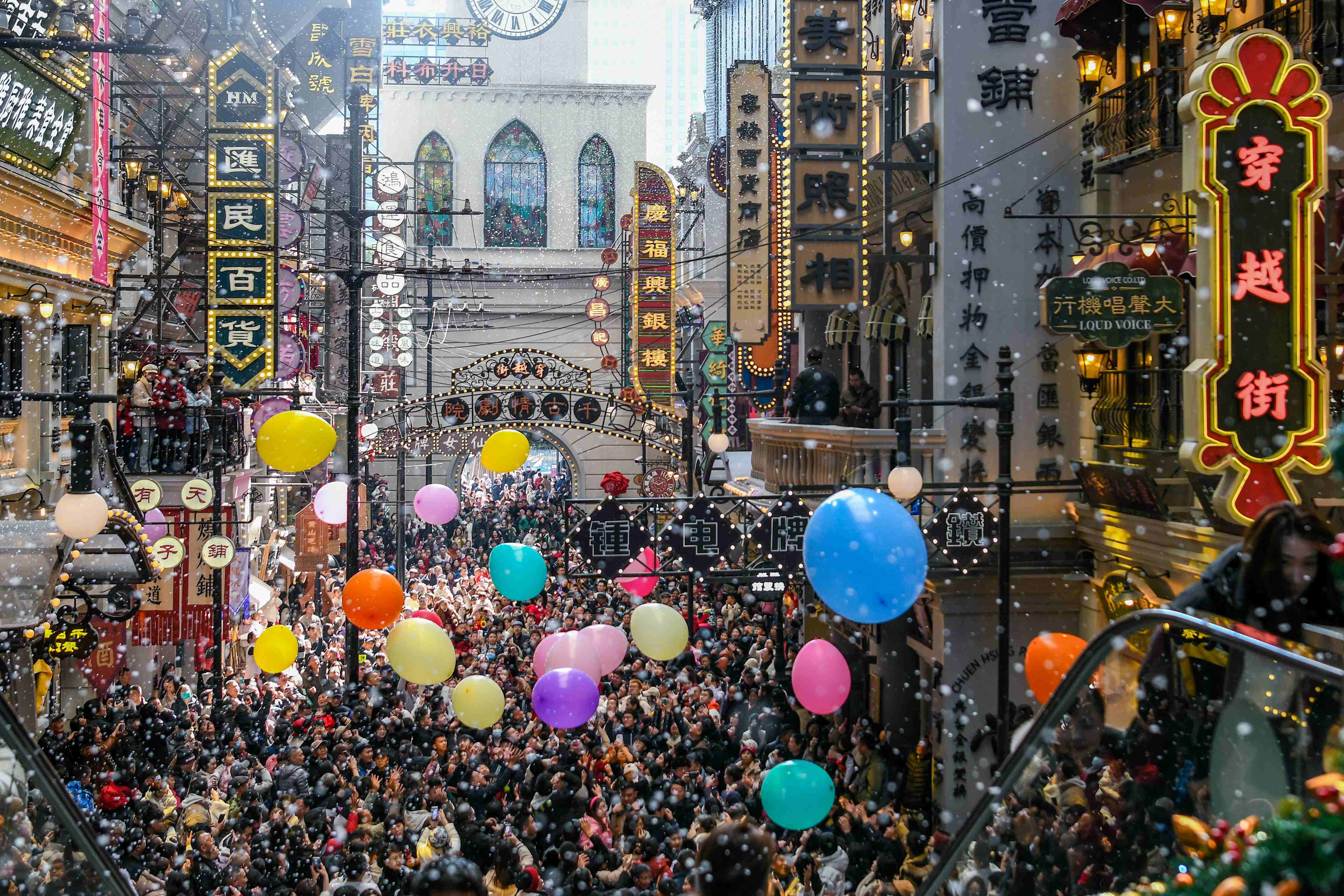 头图为上海千古情景区里,市民在穿越街参与新春巡游。劳动报记者颜筱依 摄影
