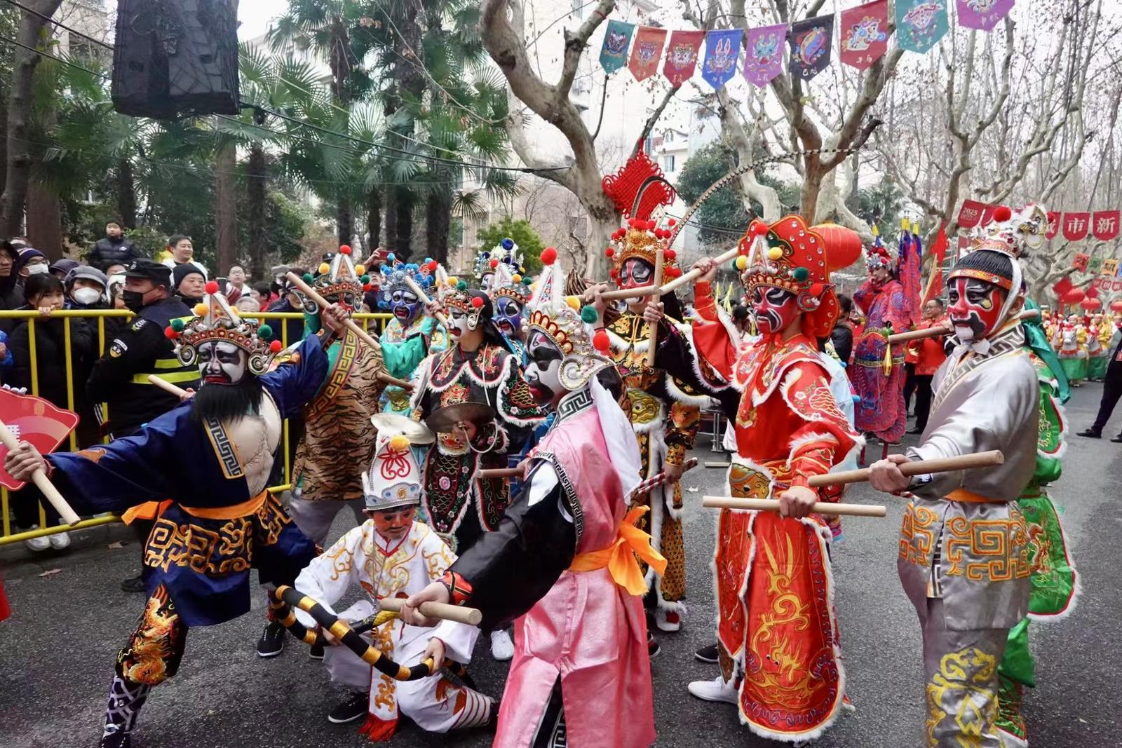 巡游队伍中,各地优秀非遗团队尤其抢眼。除了上海本地非遗队伍外,还有春晚火出圈的英歌舞、气势磅礴的浙江省长兴县百叶龙,以及杨浦区结对“好朋友”云南省丽江市纳西族乐巴舞等,生动展现多元文化交融场景,引得市民阵阵欢呼与掌声。