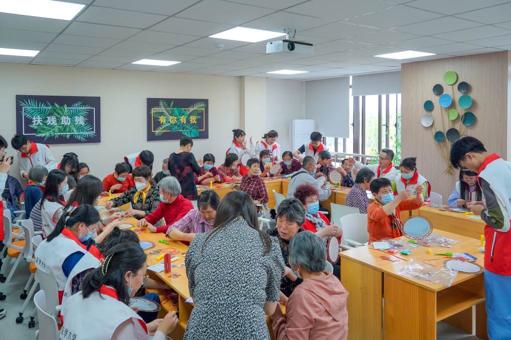 头图为志愿者与老人共同编织二十四节气团扇。校方供图